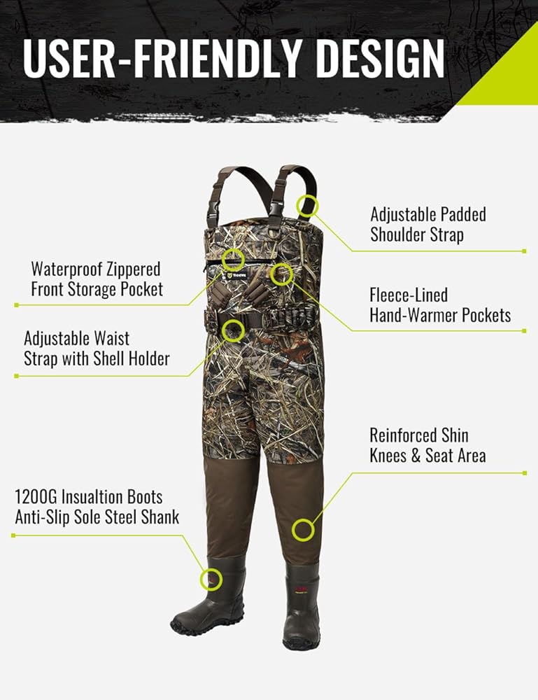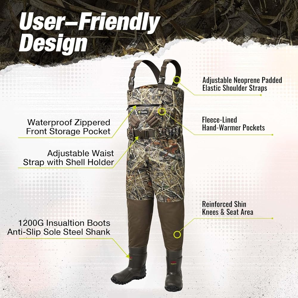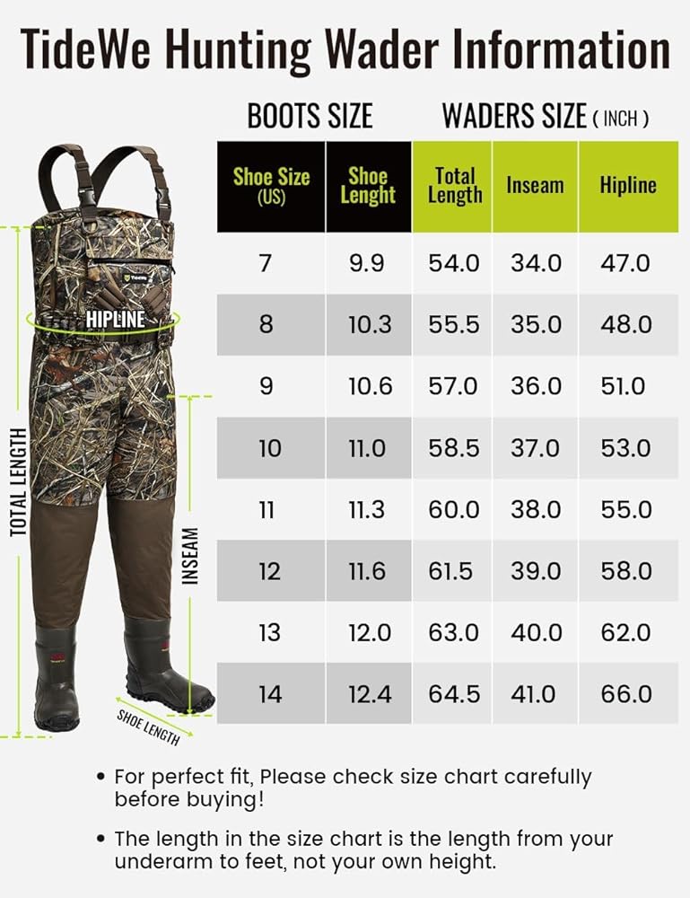 【User-Friendly Design】TIDEWE hunting waders also have 600D Reinforced Shin in Knees and seat area, providing more durability. Adjustable heavy duty elastic suspenders allow you to pull the waders on and off super easily due to the simple design. Fleece-lined hand-warmer pockets keep your hands warm. With zippered front storage pocket, you can remain your things dry.