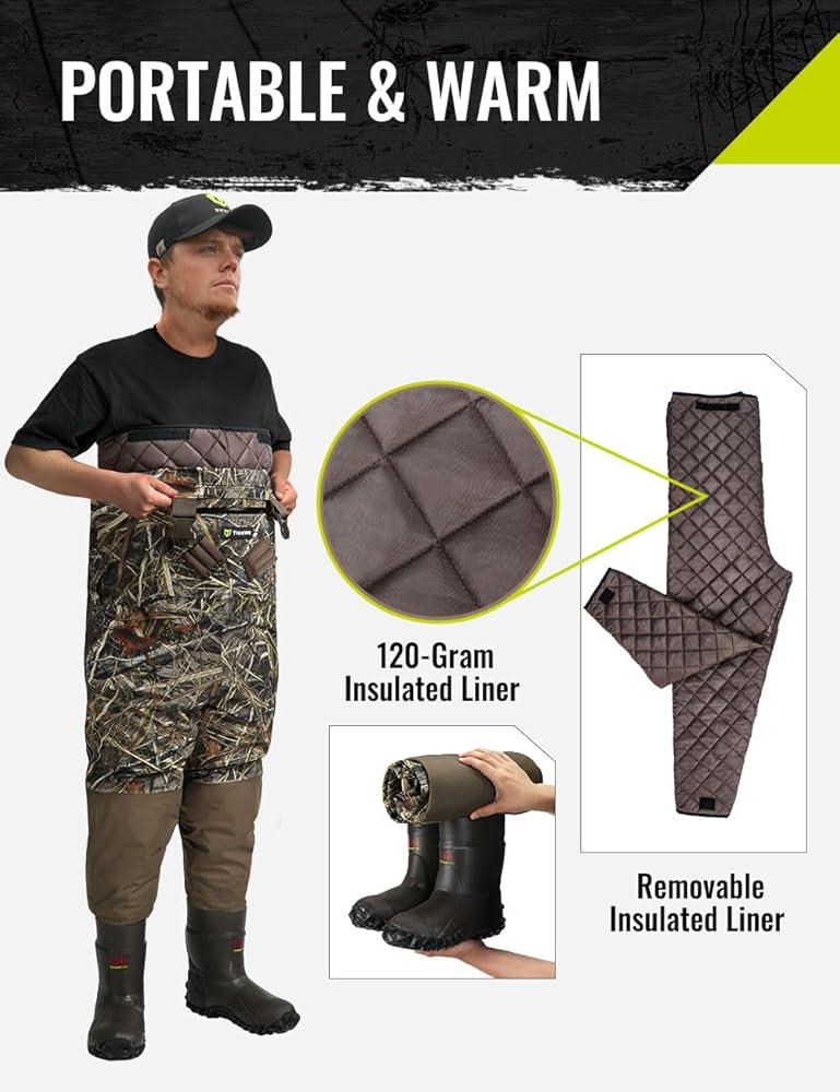 【Portable & Warm】Removable insulated liner is designed, which enables your easy carry and convenient storage of the waders. Lined with 120g of insulation that is quilted form uniform warmth. With 1200 gram Thinsulate Insulated Boot, your feet have a chance of staying warm in cold water temperatures;Portable-convenient 10000mAh power bank adds 2 USB ports, which can charge the phone while heating the water.