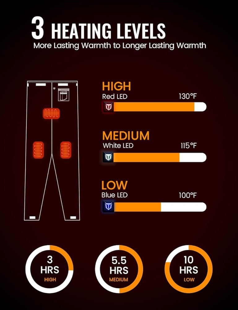 【Smart Heating Design & Safety】TIDEWE heated waders feature 3 adjustable heat settings; Up to 10 working hours on the lowest setting, 5.5 hours on medium, 3 hours on high. It can be fully charged in 3-4 hours,quick charge is only 2 hours. With the certified battery, our waders will keep you warm and safe at the same time.