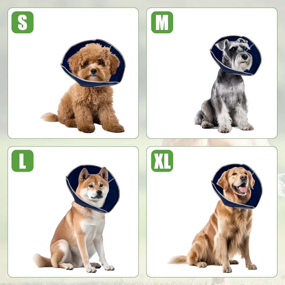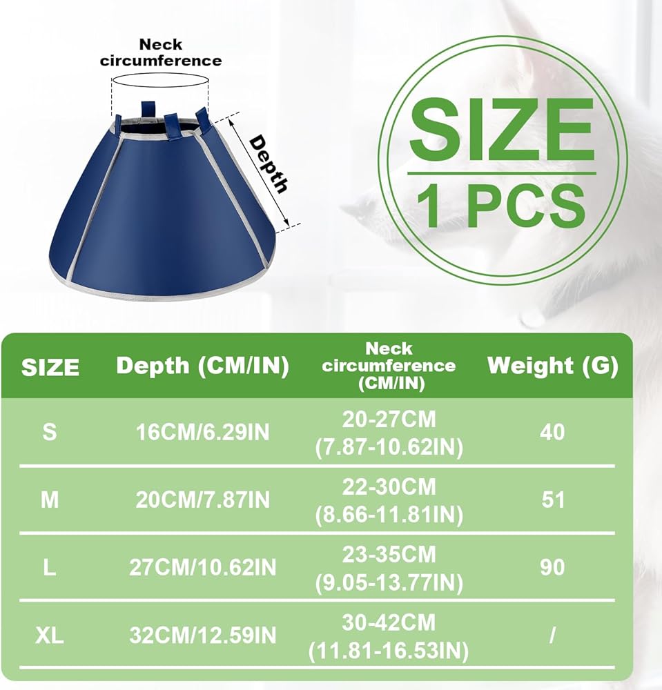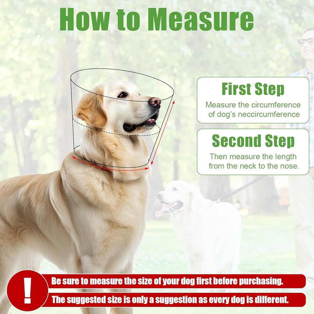 Product Size: Our dog anti lick cones in 4 sizes. S: Neck Girth: 7.8-10.6 inch / 19.8-26.9cm, Depth: 6.2 inch / 15.7cm; M: Neck Girth: 8.66-11.8 inch / 22-30cm, Depth: 7.87 inch / 20cm; L: Neck Girth: 9.05-13.77 inch / 23-35cm, Depth: 10.62 inch / 27cm; XL: Neck Girth: 11.81-16.53 inch / 30-42cm, Depth: 12.59 inch / 32cm. Please confirm the size before purchasing.