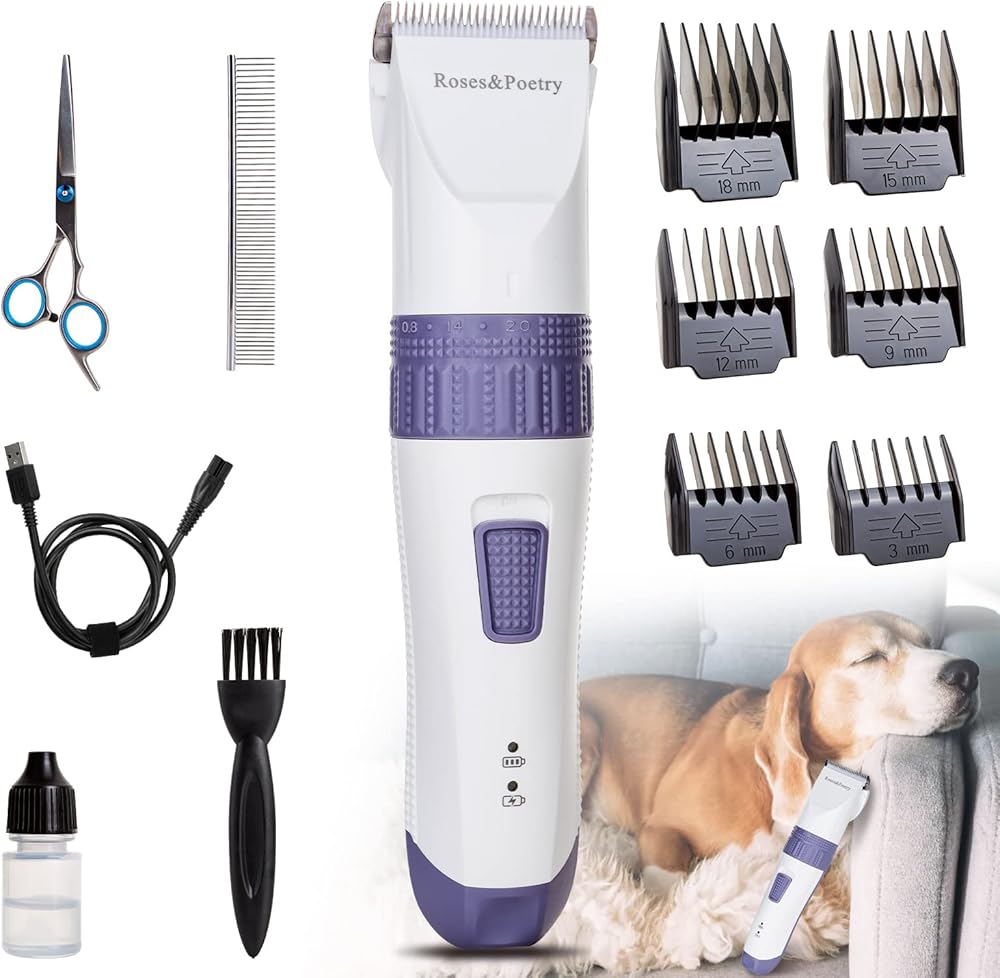 Roses&Poetry Dog Clippers,Pet Hair Trimmer,Cordless Dog Cat Pet Grooming Clipper & Dog Hair Trimmer Tools,Rechargeable Low Noise & Suitable for Dogs,Cats and Other Pets Grooming kit