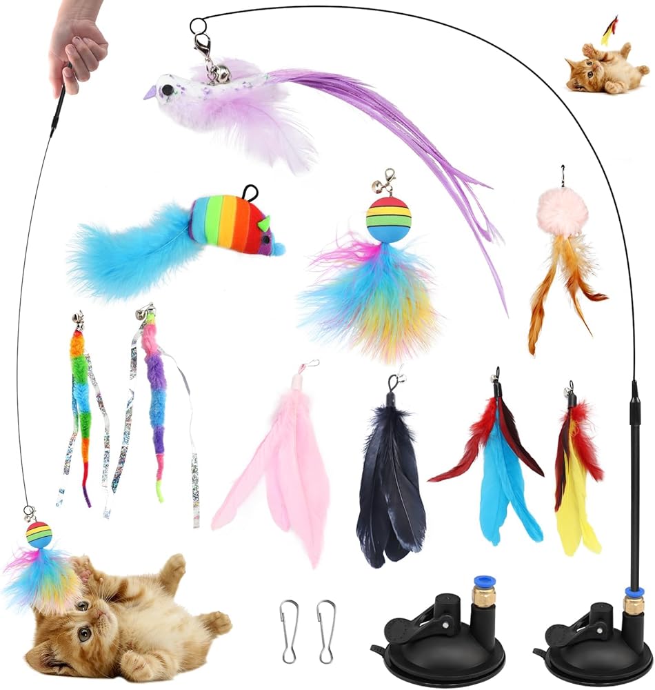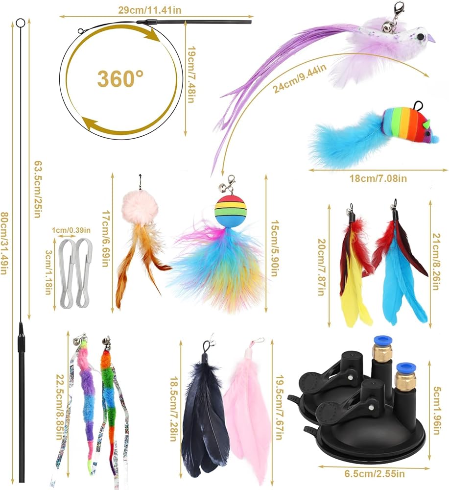 【😸Cat Toys Set】 Interactive pet toys has a beautiful packaging box, you can give interactive feather cat toy as a gift to your cat. This high-quality 15-piece interactive cat toy feather contains 2 cat rods, 2 suction cups, 4 feather toys with bells, 2 fur toys; rainbow mouse, purple flame luan bird, colourful stimulating ball, pink fur ball, 2 riding furs. Provides an interactive and exciting gaming experience. The bright colors and bells attract your cat's attention and encourage them to play