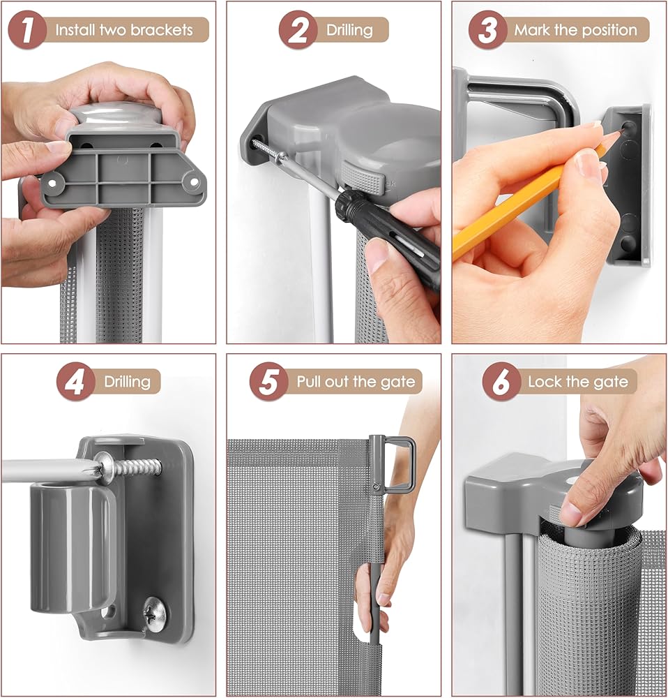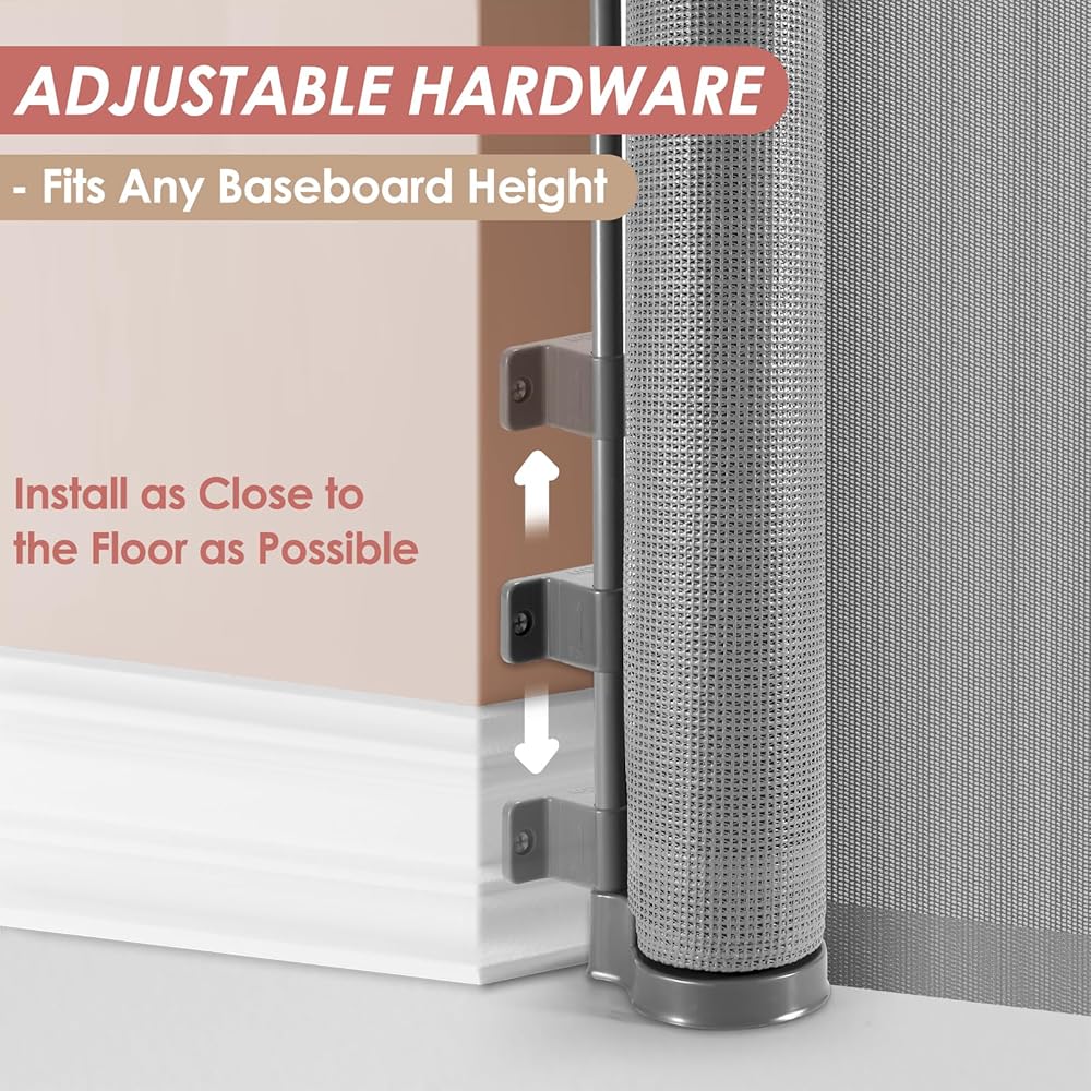 Adjustable Baseboard Hardware: Our retractable dog gate comes with all the necessary hardware and detailed instructions. The bottom bracket can be adjusted to fit various baseboard heights, ensuring a quick and easy installation.