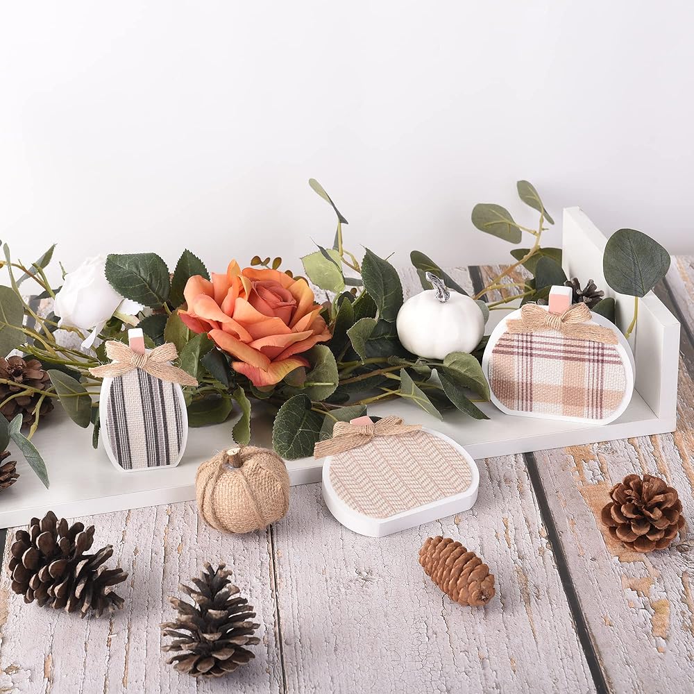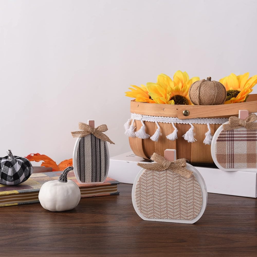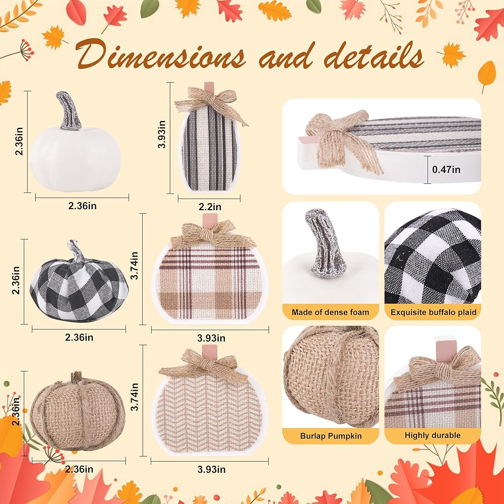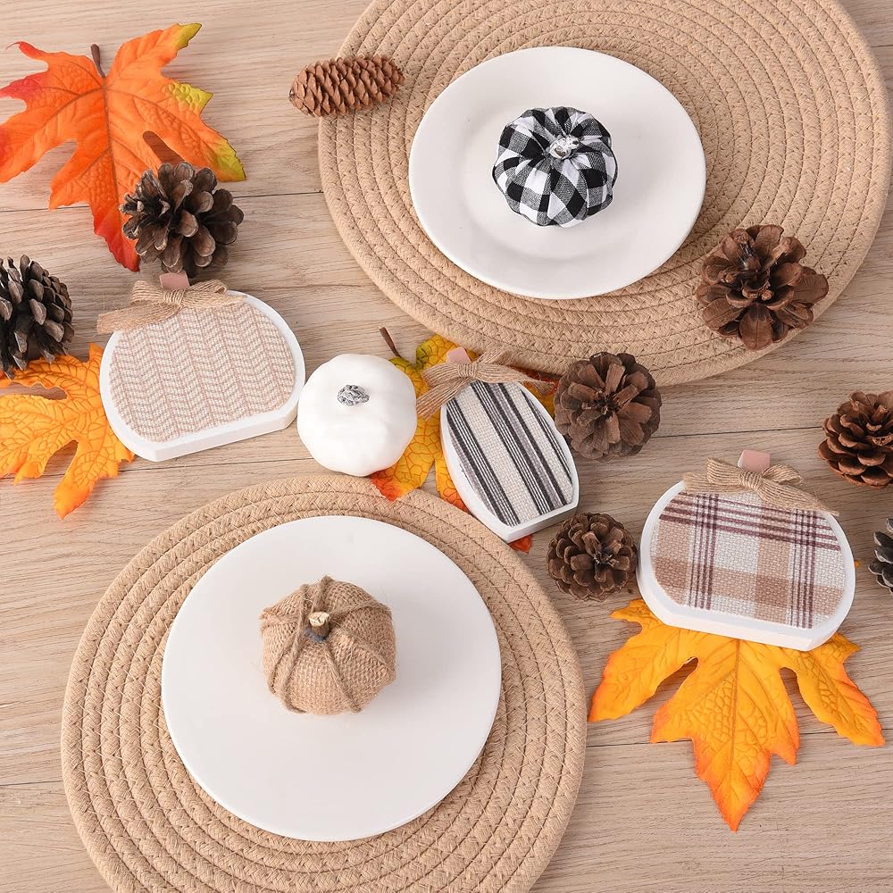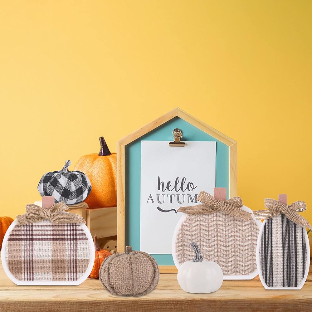 6 قطع من ديكورات اليقطين الاصطناعية من اول ريال، مجموعة صينية ديكور من الخيش الابيض بنمط مربعات اليقطين على سطح الطاولة لافتة خشبية للمنزل والرفوف والحصاد وعيد الشكر والهالوين
