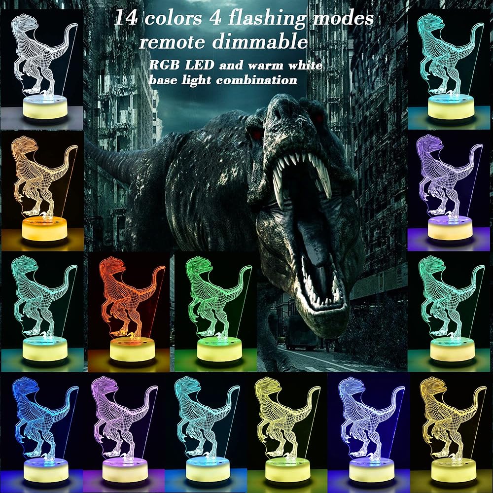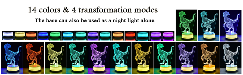 【إضاءة ليلية رائعة】ضوء ليلي رائع على شكل ديناصور، مصابيح LED RGB تنبعث منها 14 لونًا، تظهر نمط فيلوسيرابتور الرائع. يمكن استخدام القاعدة البيضاء الدافئة دون تركيب لوحة النمط. إنه مصباح ديكور رائع / ضوء جو / مصباح مكتب