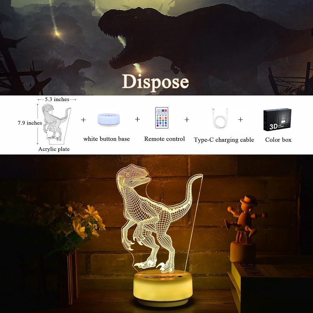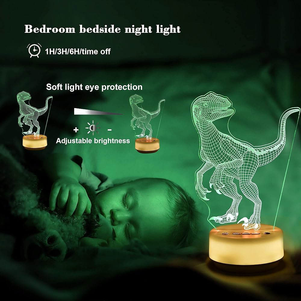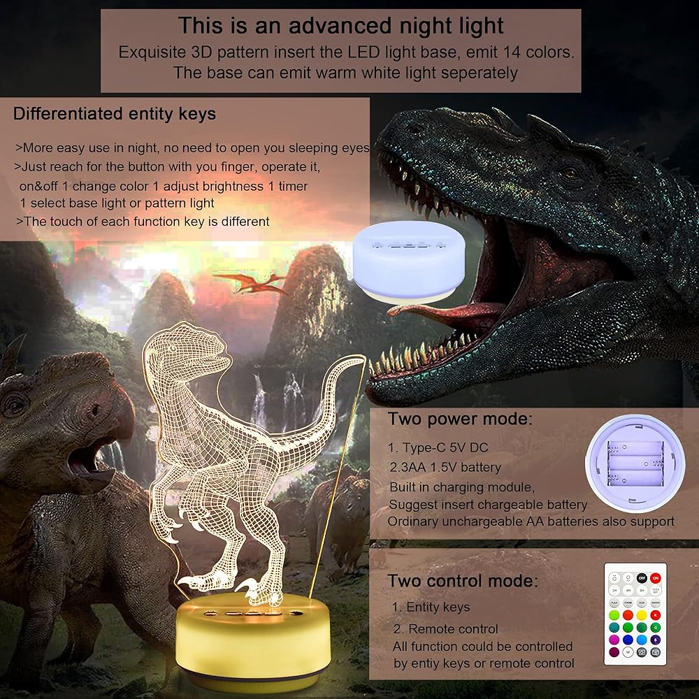 القاعدة عبارة عن ضوء ليلي أبيض دافئ مع وظيفة المؤقت (ساعة واحدة / 3 ساعات / 6 ساعات / إيقاف)، والتي يمكن استخدامها بمفردها، أو يمكنك استخدام جهاز التحكم عن بعد لتشغيل الضوء والتحكم الأطفال 3 الأطفال 3 يمكن تشغيل ألعاب الإضاءة الليلية على شكل ديناصور دي عن طريق وصلة USB أو بطارية 3AA قابلة لإعادة الشحن، وهي أكثر ملاءمة للاستخدام مع مصدر إضاءة LED، الضوء ناعم وموحد، غير مبهر، لا يومض، ولن يؤذي العينين. تستخدم مصابيح الأطفال الساطعة على نطاق واسع في بيئات مختلفة كمصابيح زينة للعائلات وغرف النوم وغرف الأطفال وغرف المعيشة والحانات والمتاجر والمقاهي والمطاعم والحفلات والنوادي وأي مكان تريده