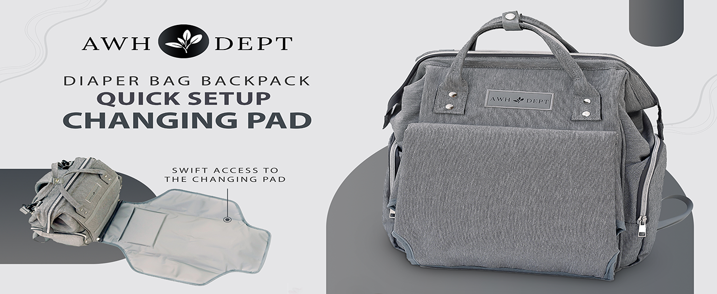 حقيبة حفاضات AWH Dept مع وسادة تغيير - حقيبة ظهر كبيرة لحفاضات السفر لجميع مستلزمات الأطفال والحفاضات - حقيبة ظهر مقاومة للماء مع وسادة تغيير محمولة (رمادي)
