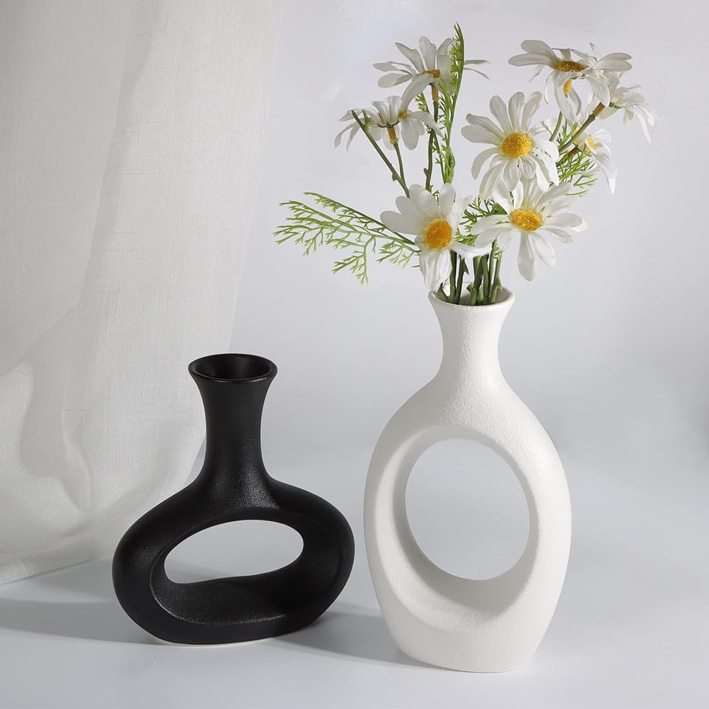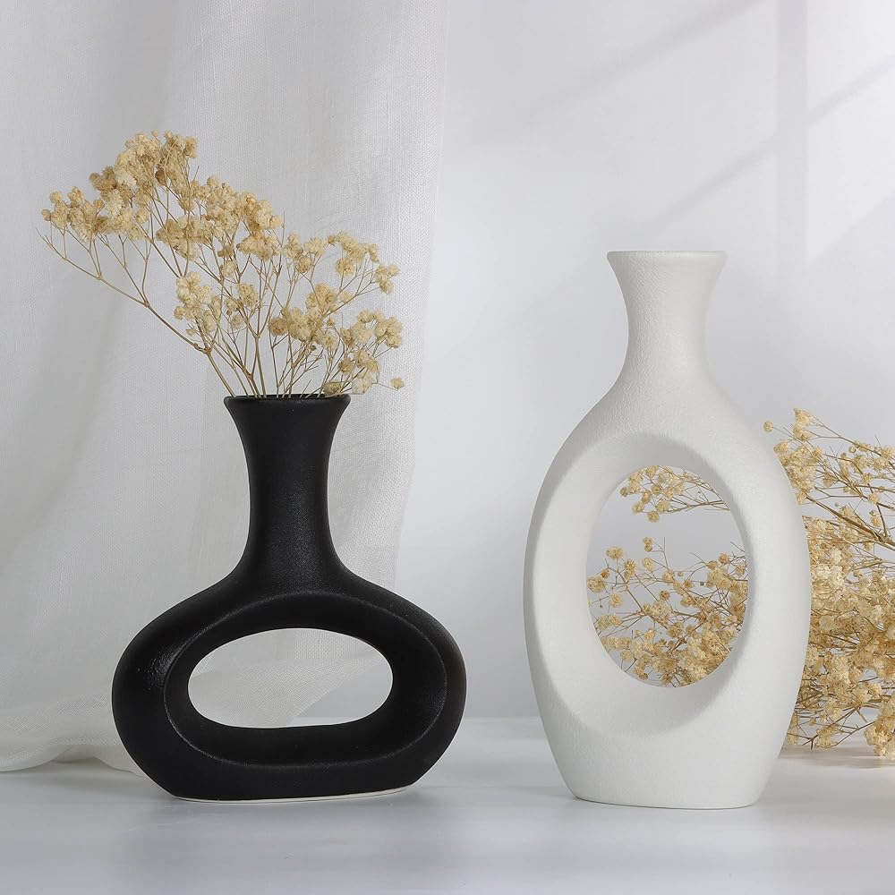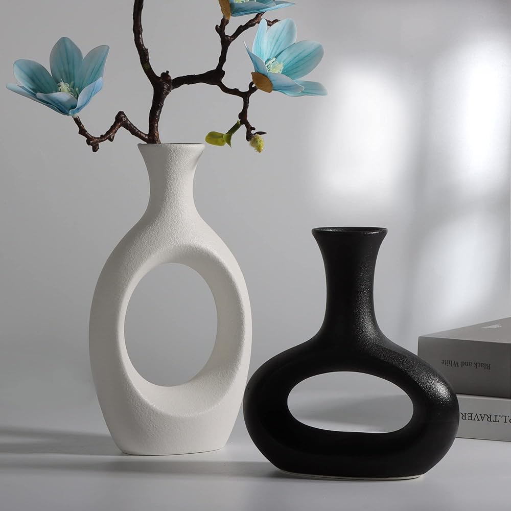 The7boX Black and White Ceramic Hollow Vase Set of 2, Household Decoration Vase Modern Central Decoration Vase for Flowers Green Plants for Living Room Bedroom 8.7''H/6.4''H