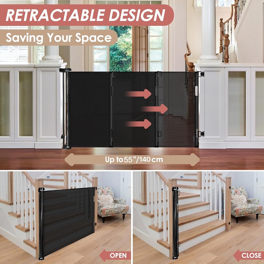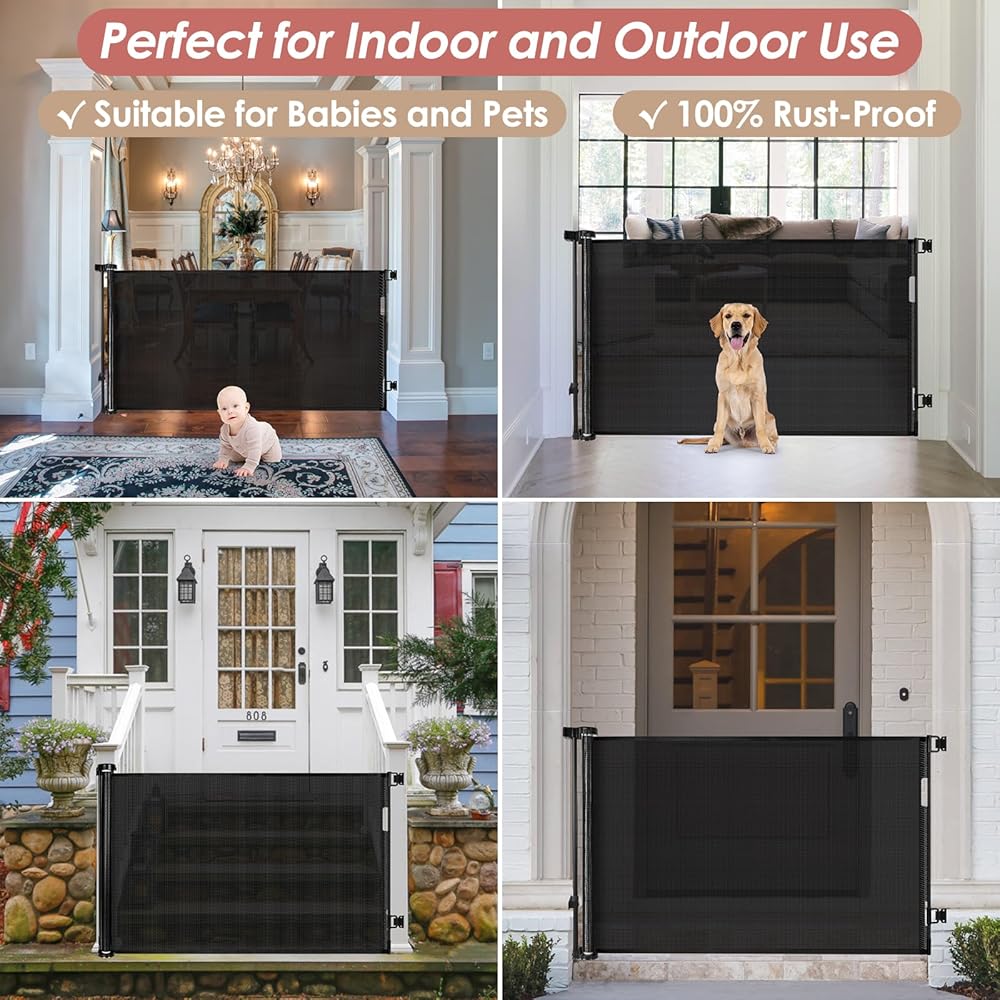 55-Inch Retractable Baby Gate: Our adjustable-width retractable gate, measuring 55" wide x 35" tall, ensures a perfect fit for your needs. Its flexibility allows it to adapt seamlessly to various openings such as doorways, hallways, stair bottoms, and other outdoor spaces like decks and front porches.