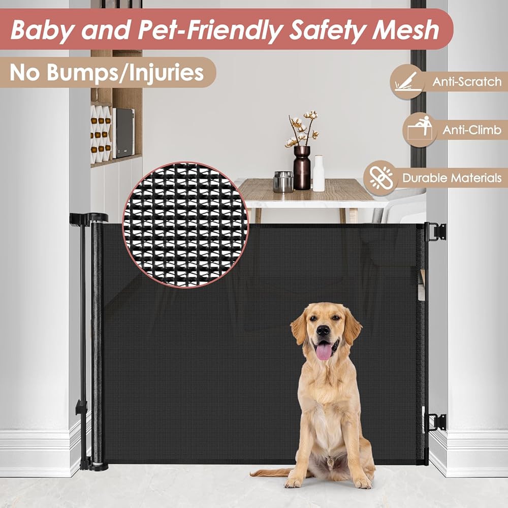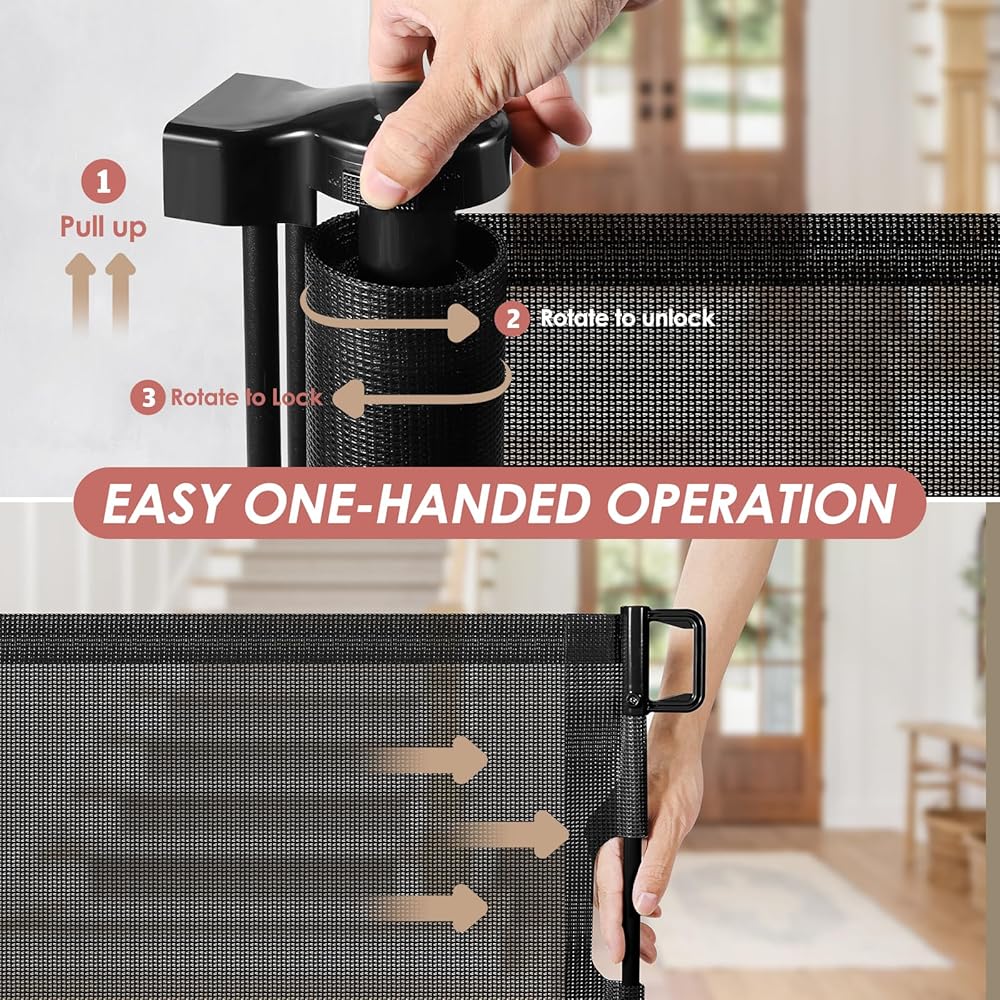 Retractable Design - Space-Saving: Our extra long baby gate is perfect for high-traffic areas. This extra wide baby gate features a space-saving design, smoothly retracting when not in use. It allows you to maximize your living space while ensuring safety during use.