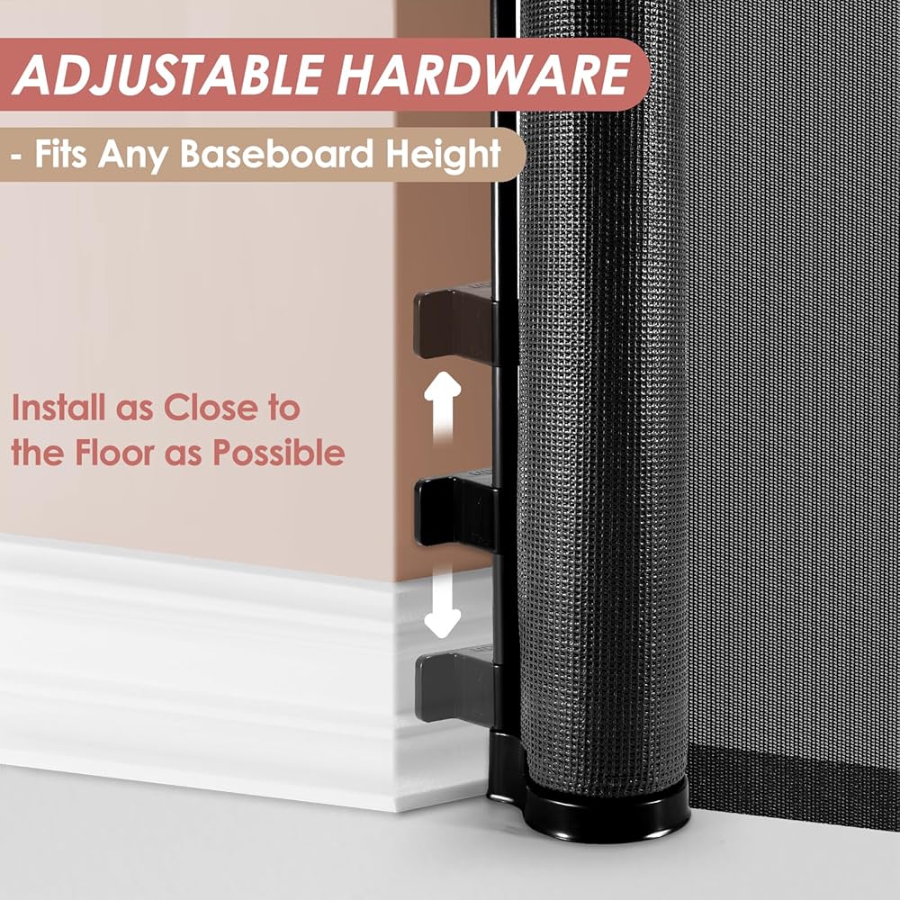 Adjustable Baseboard Hardware: Our extra long pet gate for cats comes with all the necessary hardware and detailed instructions. The bottom bracket can be adjusted to fit various baseboard heights, ensuring a quick and easy installation.