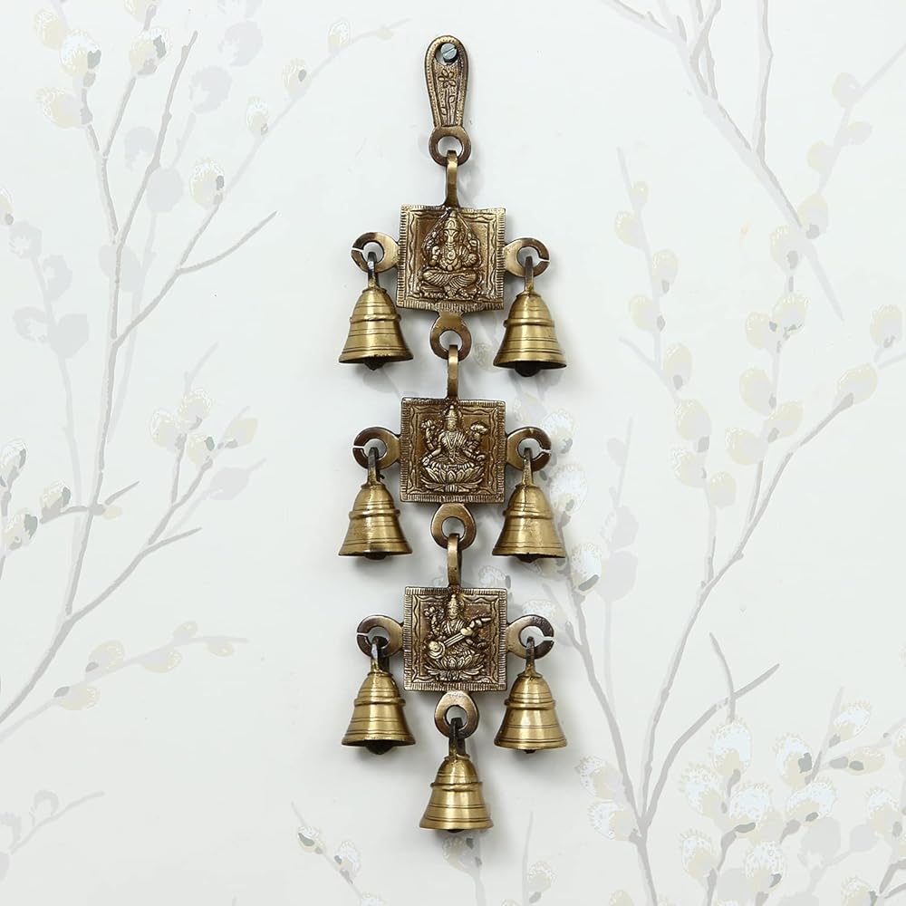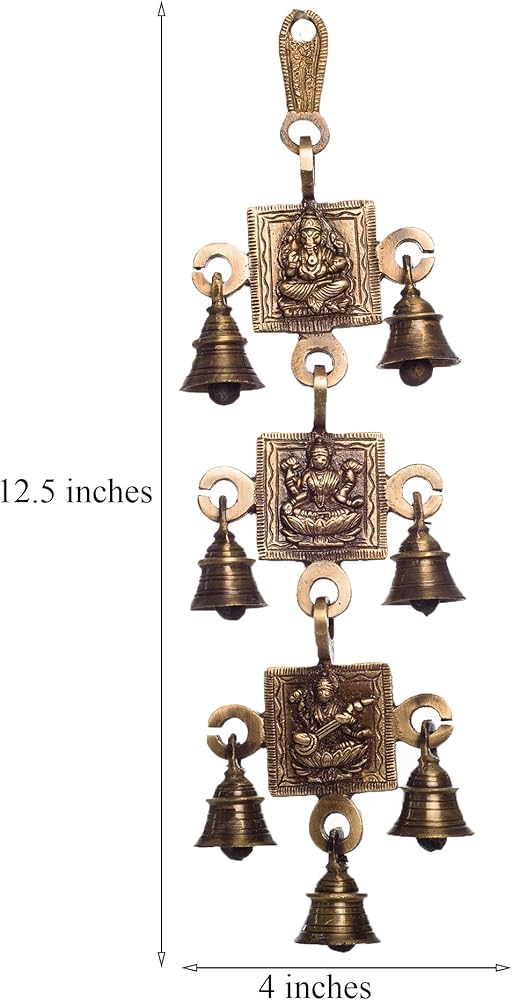 Enlighten your home with this auspicious Laxmi Ganesha Saraswati Brass Hanging Bells. Made from brass this wonderful piece of art will surely accentuate your wall decor. It serves as a great gift, especially around religious celebrations and festivities. This wall hanging has been diligently handcrafted by skilled artisans from the house of eCraftIndia using various traditional techniques.