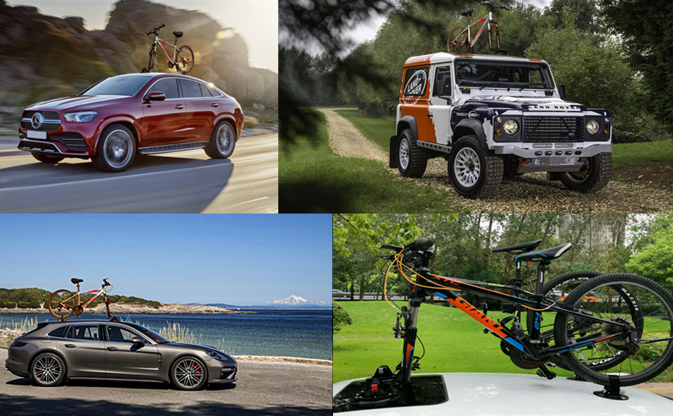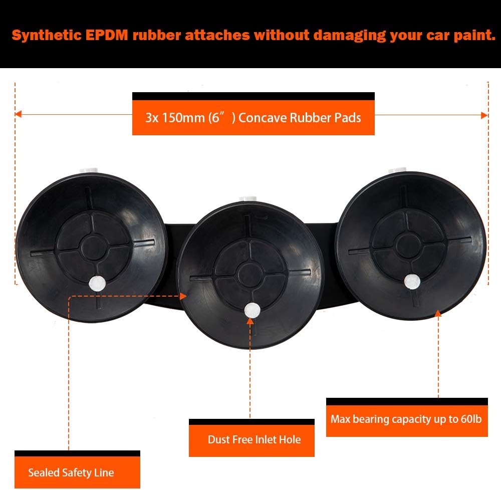 ①NEWEST VACUUM MOUNTED TECHNOLOGY: IMT vacuum mount bike carrier system consists of a high quality steel deck with three 6" vacuum mount that's home to the one fork holders, as well as a 6" separate vacuum-mounted rear wheel holders. Each suction cup uses durable UV and weather resistant concave rubber pad so that they can be attached to flat and cured surfaces.Synthetic EPDM rubber attaches without damaging your car paint.