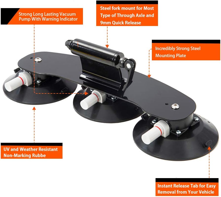 ② MULTI-APPLICATIONS & EASY INSTALLATION: The Vacuum Mount Complete Bike Rack System fits most types of vehicles. SUVs, sedans, vans, busses, trucks, cars, electric vehicles and even convertibles. It can be installed and uninstalled in less than 2 minutes.