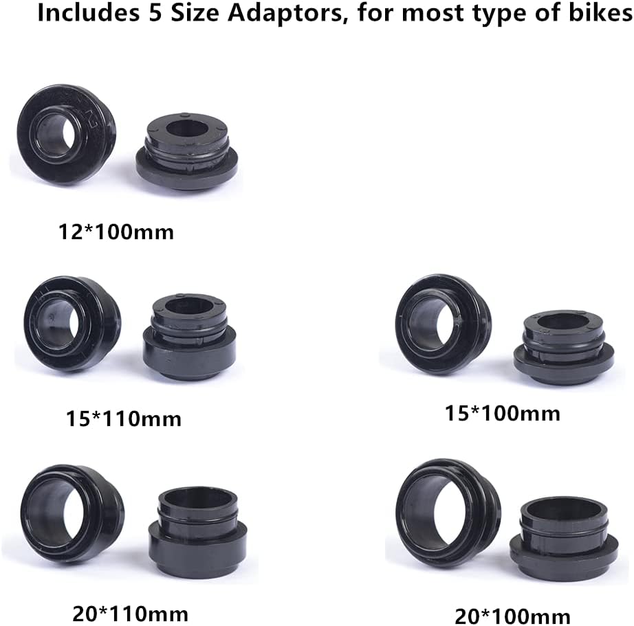 ③COMPATIBILITY: This model make use of a fork-mount, or fork-mount with thru-axle adapter. It is compatible with QR axle and thru-axle. Package includes 5 size adapters (9x100mm, 12x100mm15x100mm, 15x110mm, 20x100mm, 20x110mm). Fit for mountain bikes, road bikes,trail bike, etc, no need to buy extra adapter.
