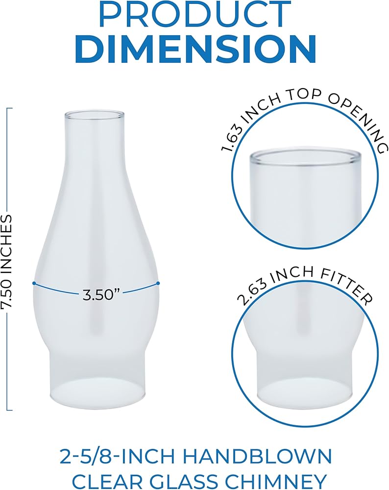 Dimensions: Oil lamp chimney has 3.50” width,7.50" length and 1.63” top opening. The handcrafted nature of glassware produces subtle variations from piece to piece, adding to each one's unique quality.