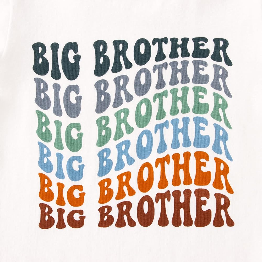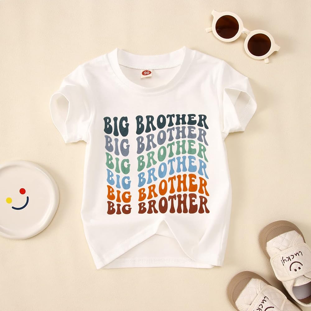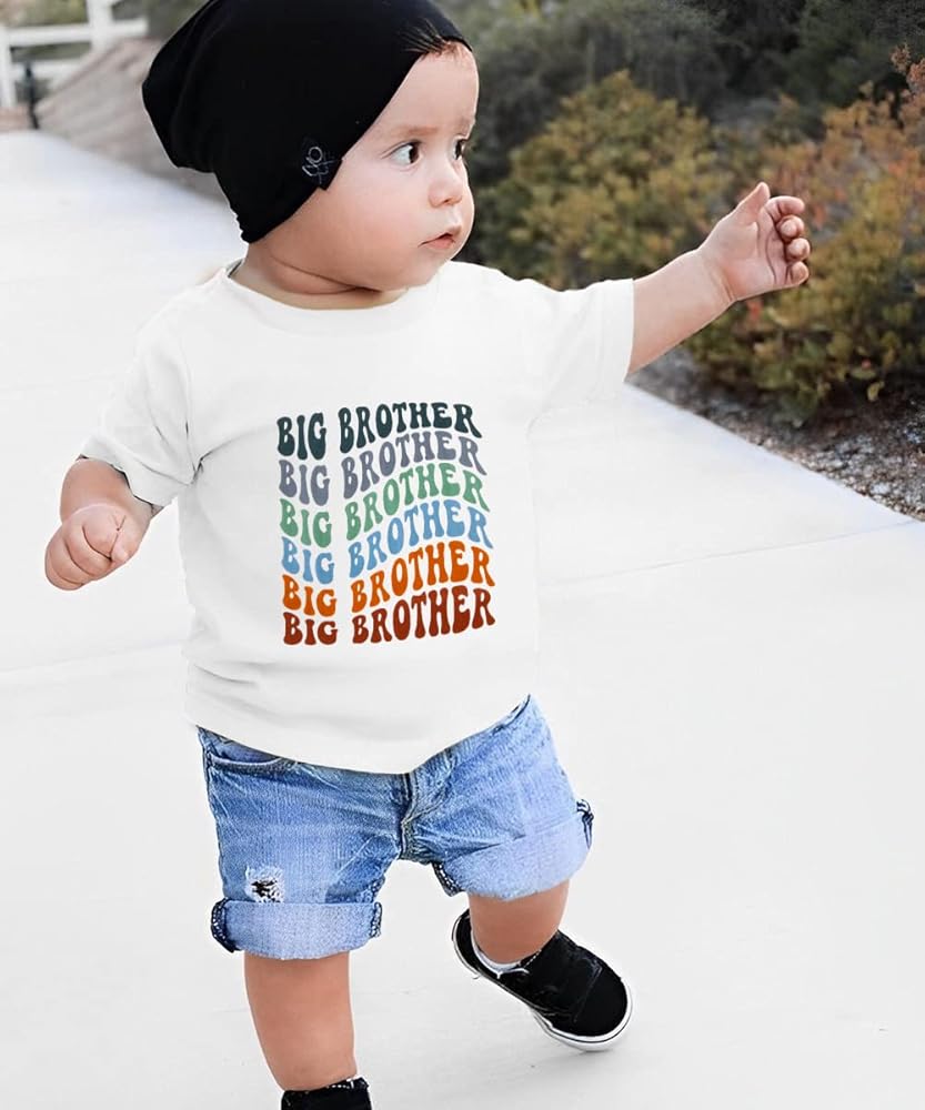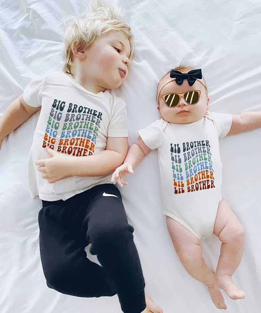 • تصميم فريد: مجموعة قمصان لطيفة للأخوة، قميص إعلان الأخ الأكبر هدايا قمصان للأطفال الصغار والأولاد الصغار، تي شيرت كلاسيكي للأطفال الصغار، أكمام قصيرة، طباعة حروف مموجة عصرية، نمط ملون رائع للأخ الأكبر والأخ ليل، فريد وجذاب. طريقة ممتعة للتعبير عن متعة وجود طفل صغير.