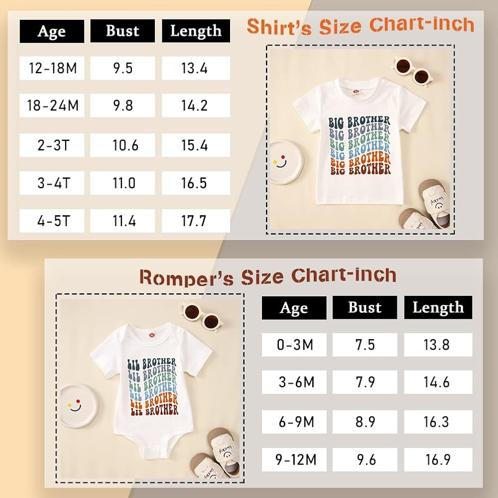 • ما تحصل عليه: 1 × تي شيرت Big Bro + 1 × بدلة قطعة واحدة من Lil Bro. تُباع ملابس الأخ المتطابقة بشكل منفصل. إذا كنت ترغب في شراء القميص والرومبير، فيرجى وضع جميع المقاسات في عربة التسوق ثم طلبهما معًا.