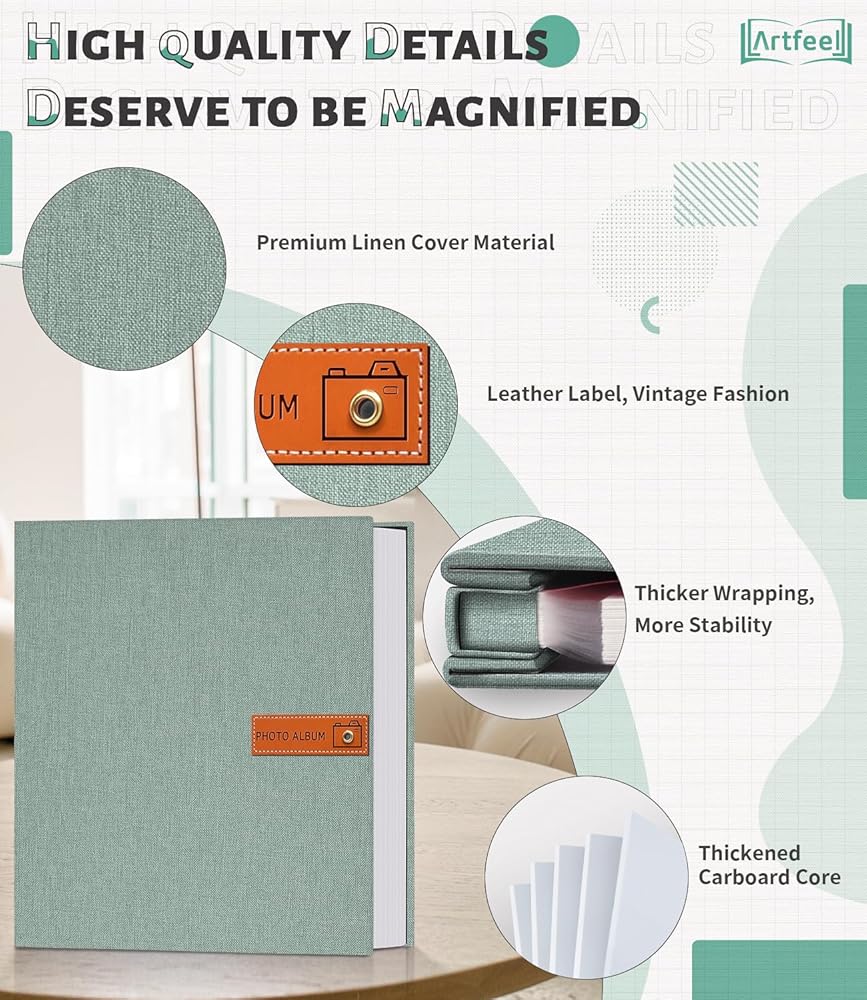 • 🔥جودة ممتازة: يتميز ألبوم الصور الخاص بنا بغطاء ملفوف بالكتان عالي الجودة، يكمله ملصق جلدي بني كلاسيكي. يوفر إطار الألبوم المتين المصنوع من الورق المقوى هيكلًا ثابتًا. الصفحات الداخلية مربوطة بإحكام بأعمدة ألومنيوم قوية، مما يضمن بقائها ثابتة في مكانها دون أي خطر من الانفصال.