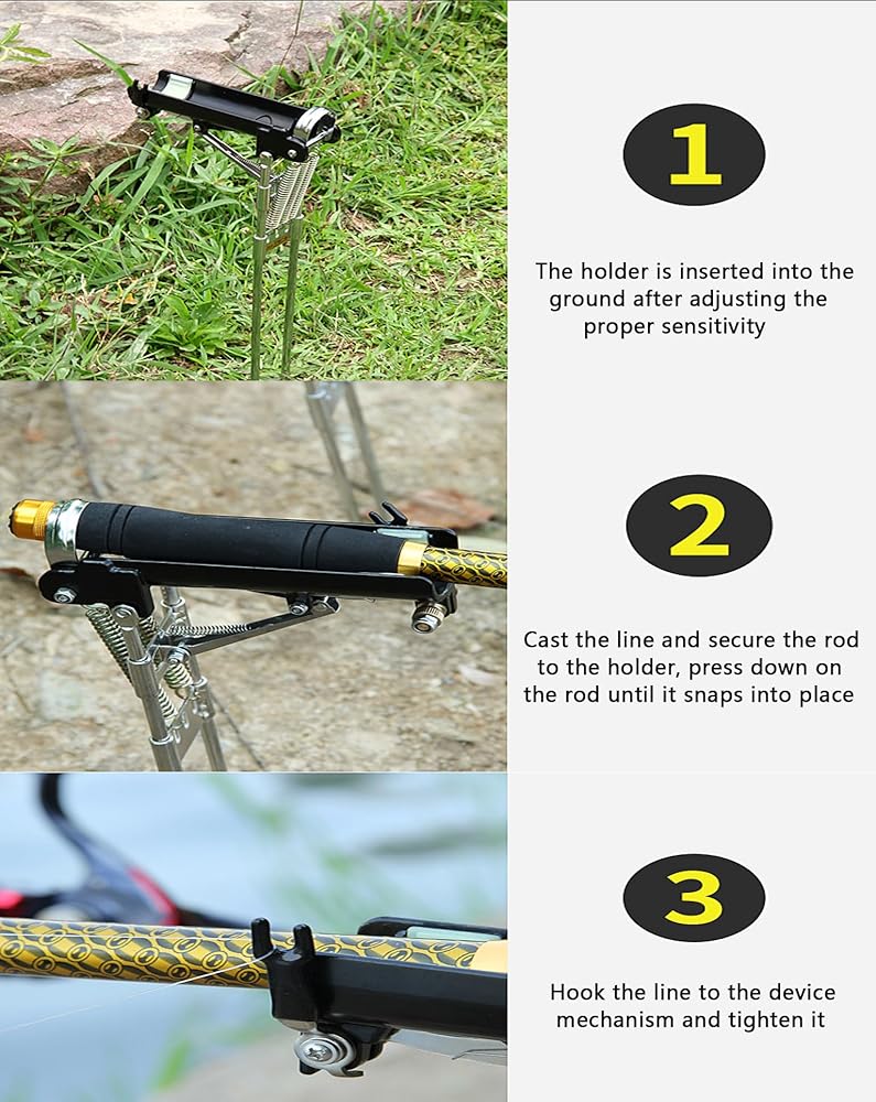 • Easy Installation Step 1:The holder is inserted into the ground after adjusting the proper sensitivity; Step 2:Cast the line and secure the rod to the holder, press down on the rod until it snaps into place; Step 3: Hook the line to the device mechanism and tighten it.