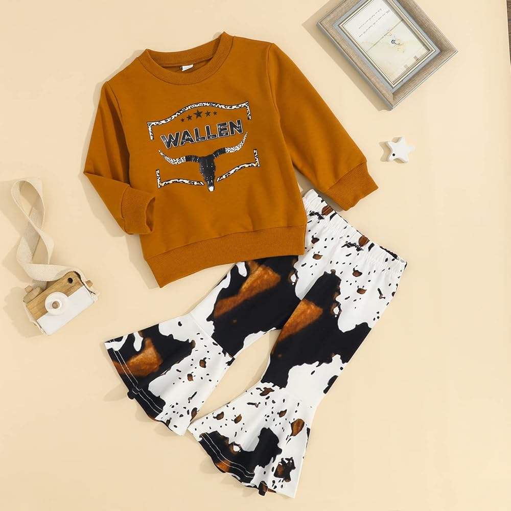 Package Includes--- 1 x Toddler Girl Cow Print Sweatshirt + 1 x Flared Bell Bottom Pants. If you have any questions, you can feel free to contact us! Machine washable, hang dry, do not bleach !