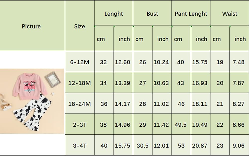 Size--- Cow print toddler girl outfit, Suitable for infant cowgirl outfit 6-12 months, 12-18 month girl clothes, western baby girl clothes 18-24 months, toddler girl western clothes 2T-3T, cow print toddler girl outfit 3-4 T, 4-5t girls bell bottom outfits, Please carefully refer to the size details we provide before purchasing!2t girls bell bottom outfits.