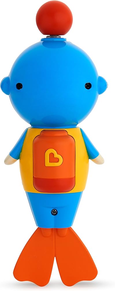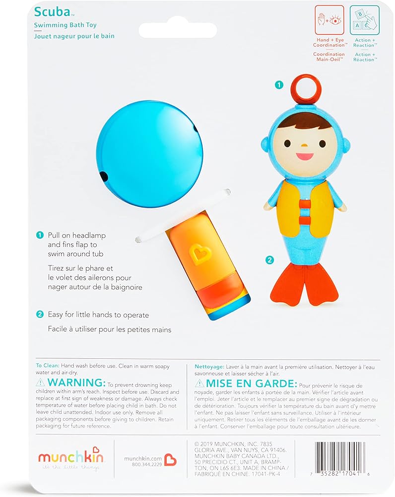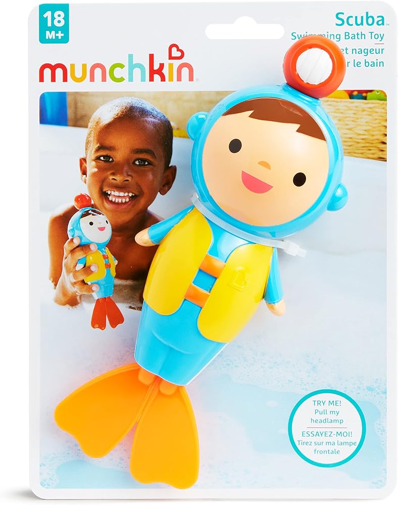 Let's go for a dive next bath time. The Munchkin Scuba Swimming Bath Toy is made for underwater fun with a fin that flaps and makes this little diver swim around the tub. The attached head lamp pull cord is easy for little hands to operate and teaches your toddler valuable skills like hand and eye coordination and action and reaction. Time to make a splash.