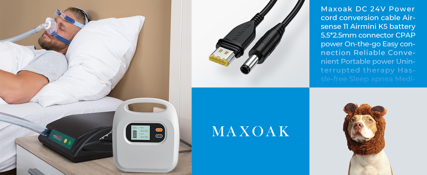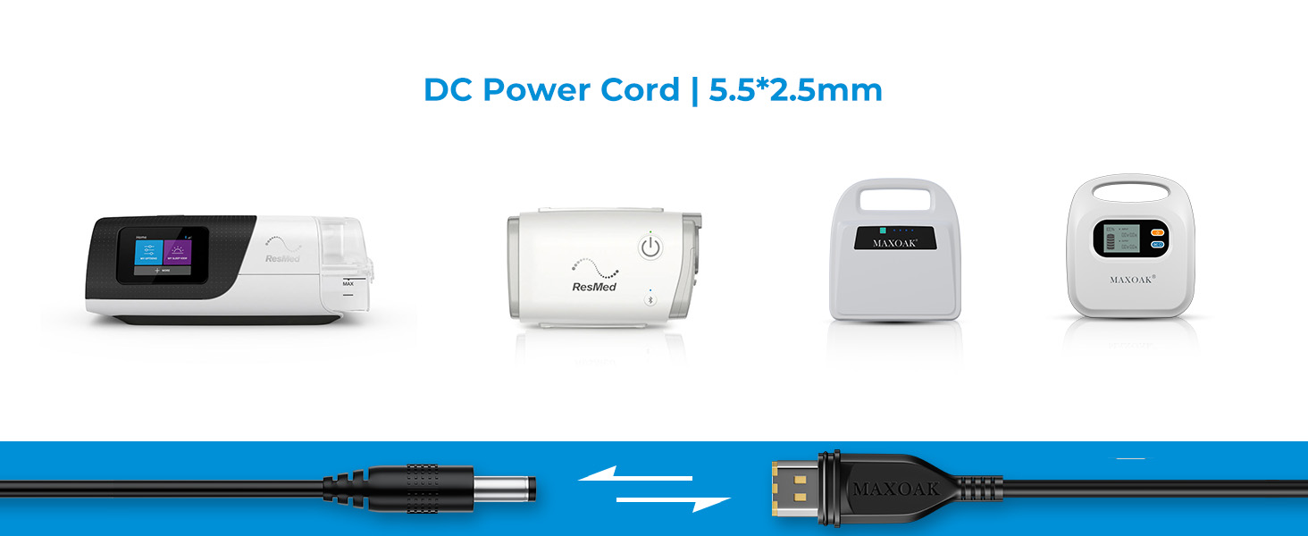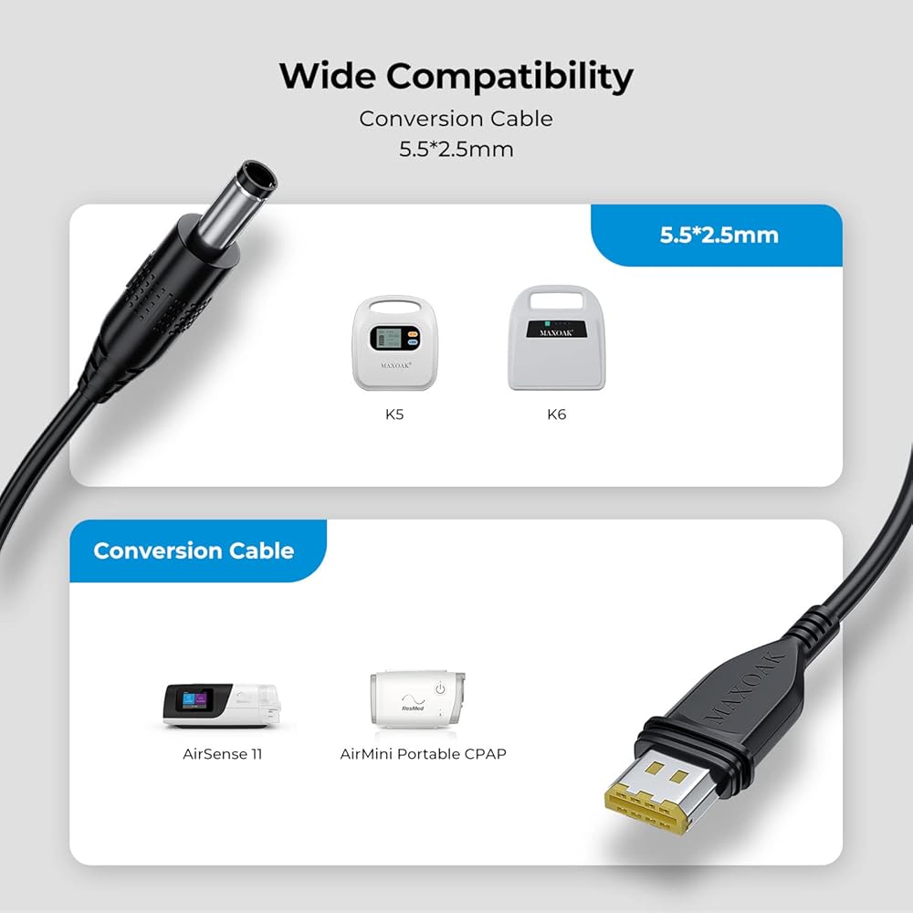 التوافق: يتوافق الكابل مع أجهزة CPAP الشهيرة مثل Airsense 11 وAirmini. ملاحظة (يجب استخدام الكابل مع بطارية MAXOAK K5 CPAP)