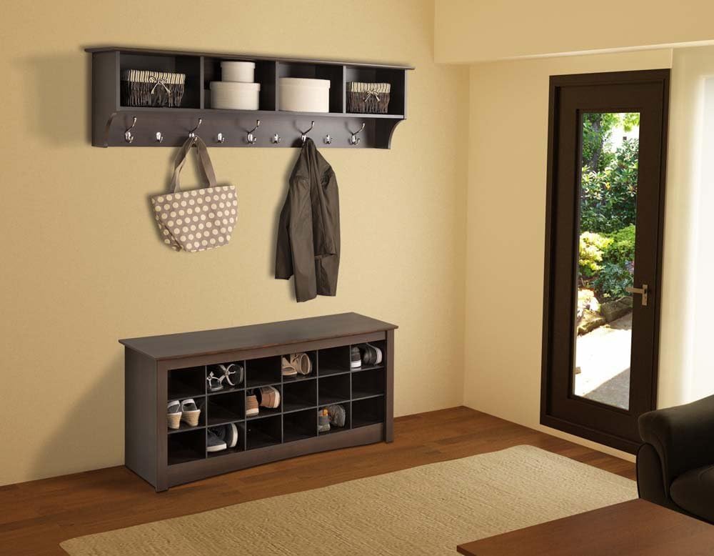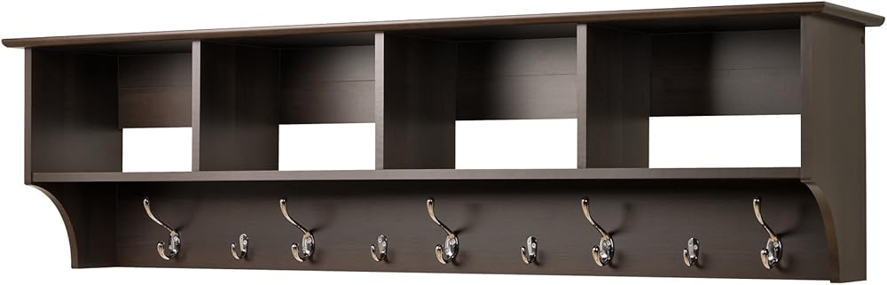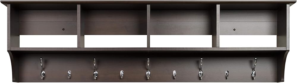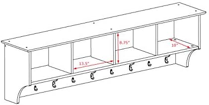 Ideal for an ever expanding household, the 60 in. Wide Hanging Entryway Shelf will keep your entryway belongings together in one place! Suitable for any front hallway, foyer or mudroom, the four compartments provide ample storage for everyone in your family. Fill with baskets, gloves, mittens, hats and books. Five large and four small hooks provide plenty of places to hang jackets, coats, hoodies, sweaters, bags and purses. Installs easily with our innovative hanging rail system.