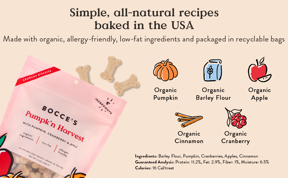 Made with organic, allergy-friendly, low-fat, ingredients (pumpkin, cranberries & apples!) and packaged in recyclable bags – this is what treating was meant to be.