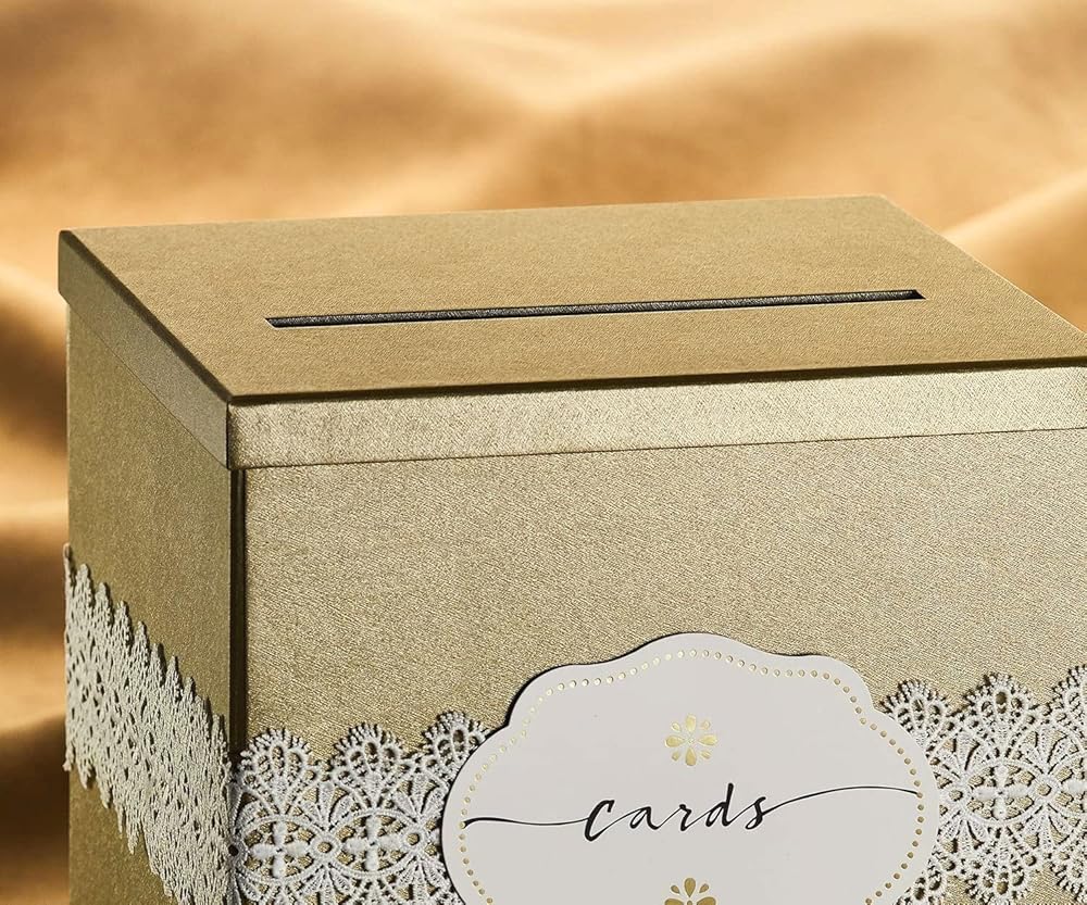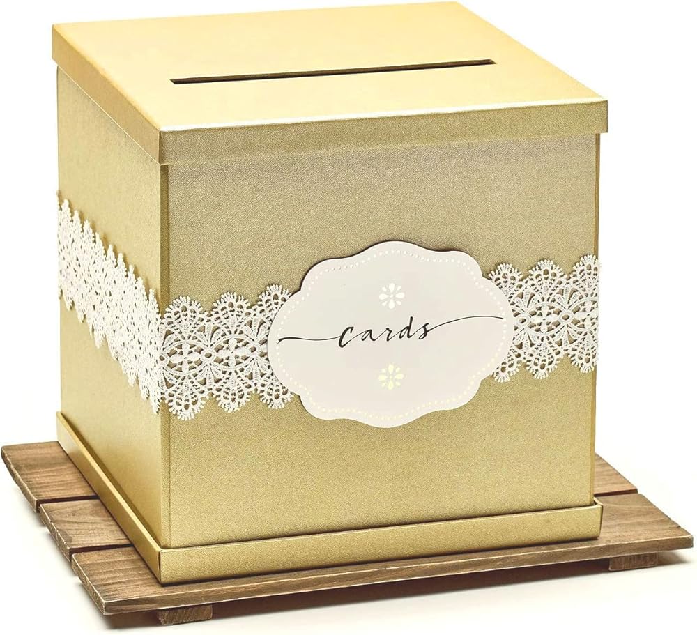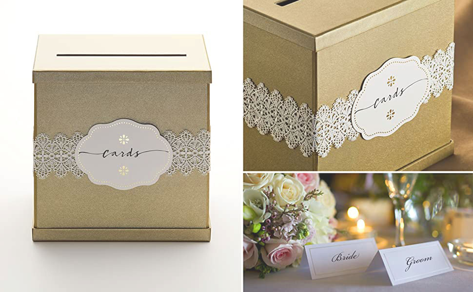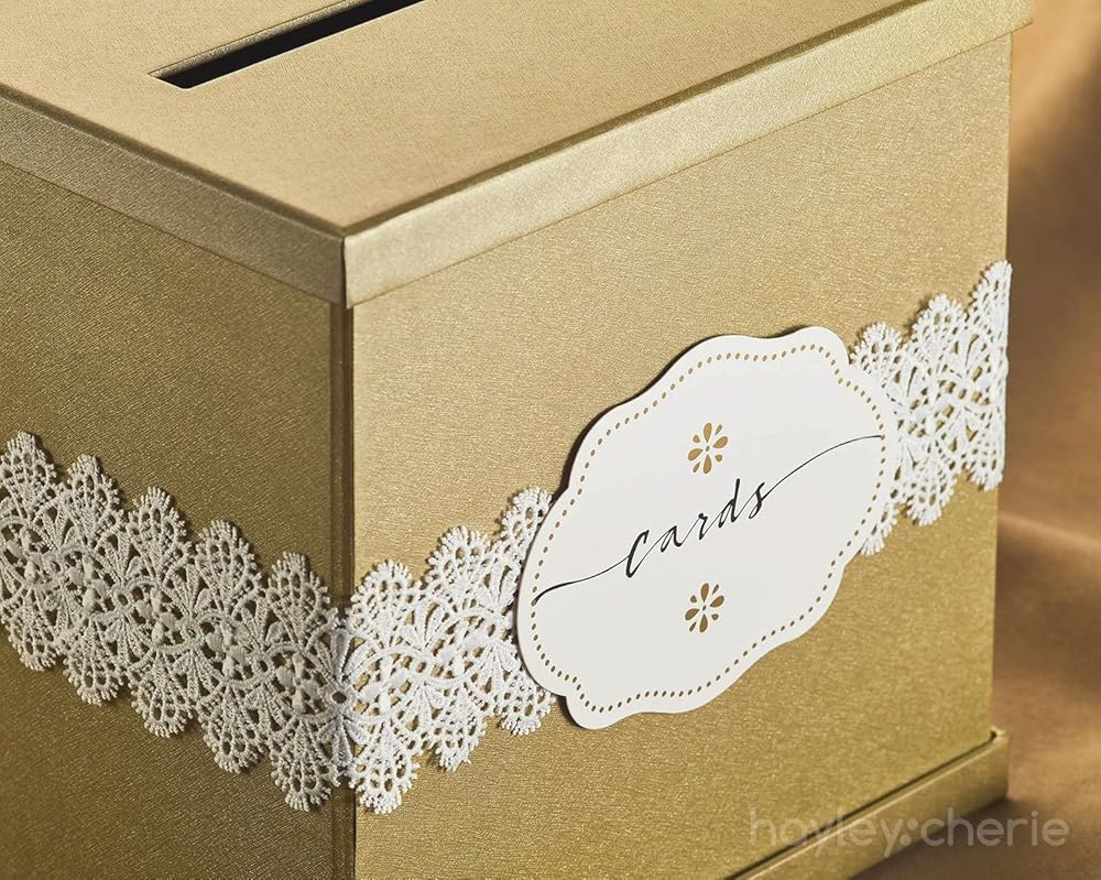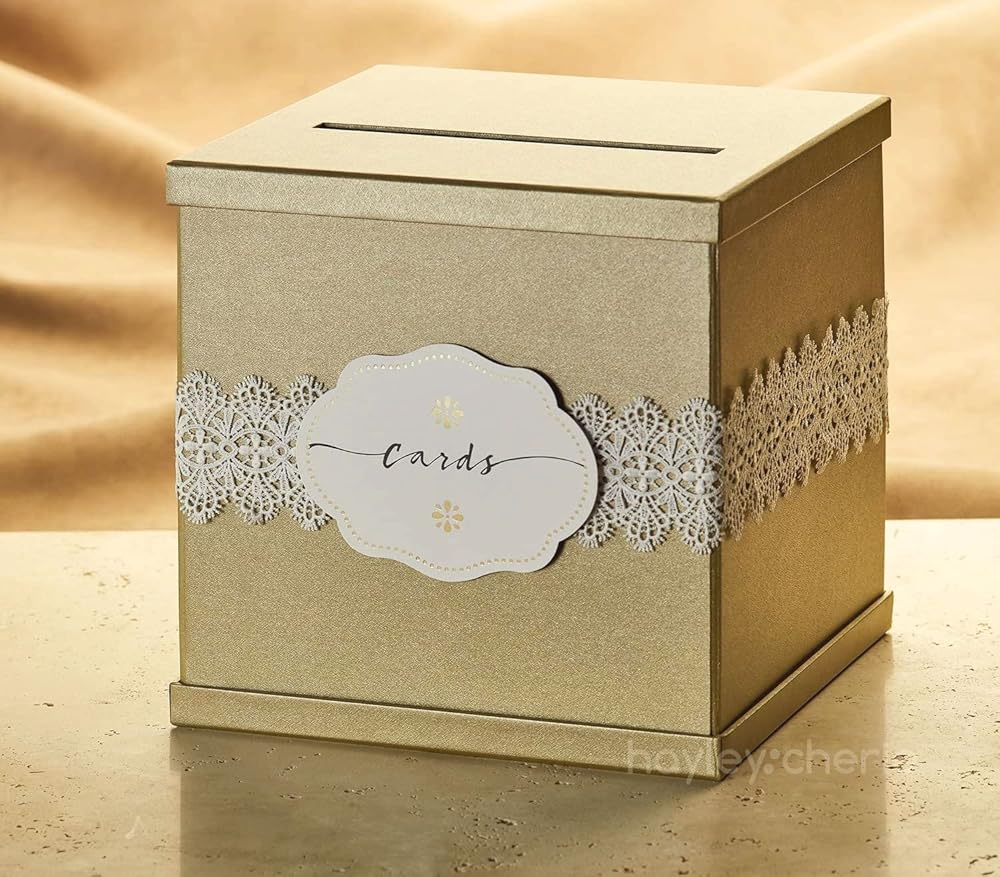جميل - صندوق بطاقات الزفاف المربع هذا مصنوع بشكل جميل من ورق مزخرف رقيق ولمسة نهائية عالية الجودة. إنه ذو لون ذهبي مع لمسة نهائية لامعة ويأتي مع دانتيل أبيض وملصق بطاقات مطبوع كملحقات اختيارية. اللمسة النهائية والملمس على مستوى عالٍ جدًا وقد تم تصميم الصندوق ليدوم ببنيته القوية.