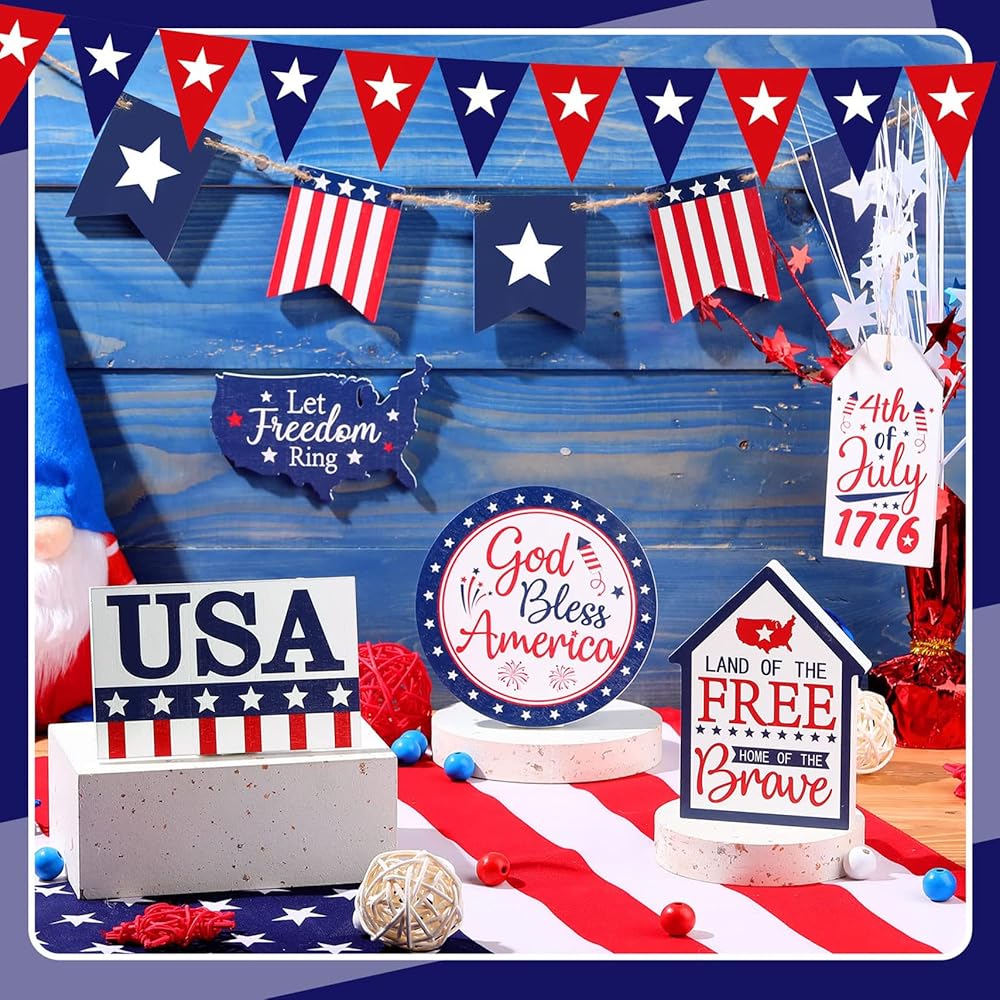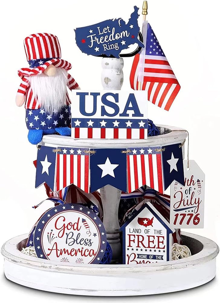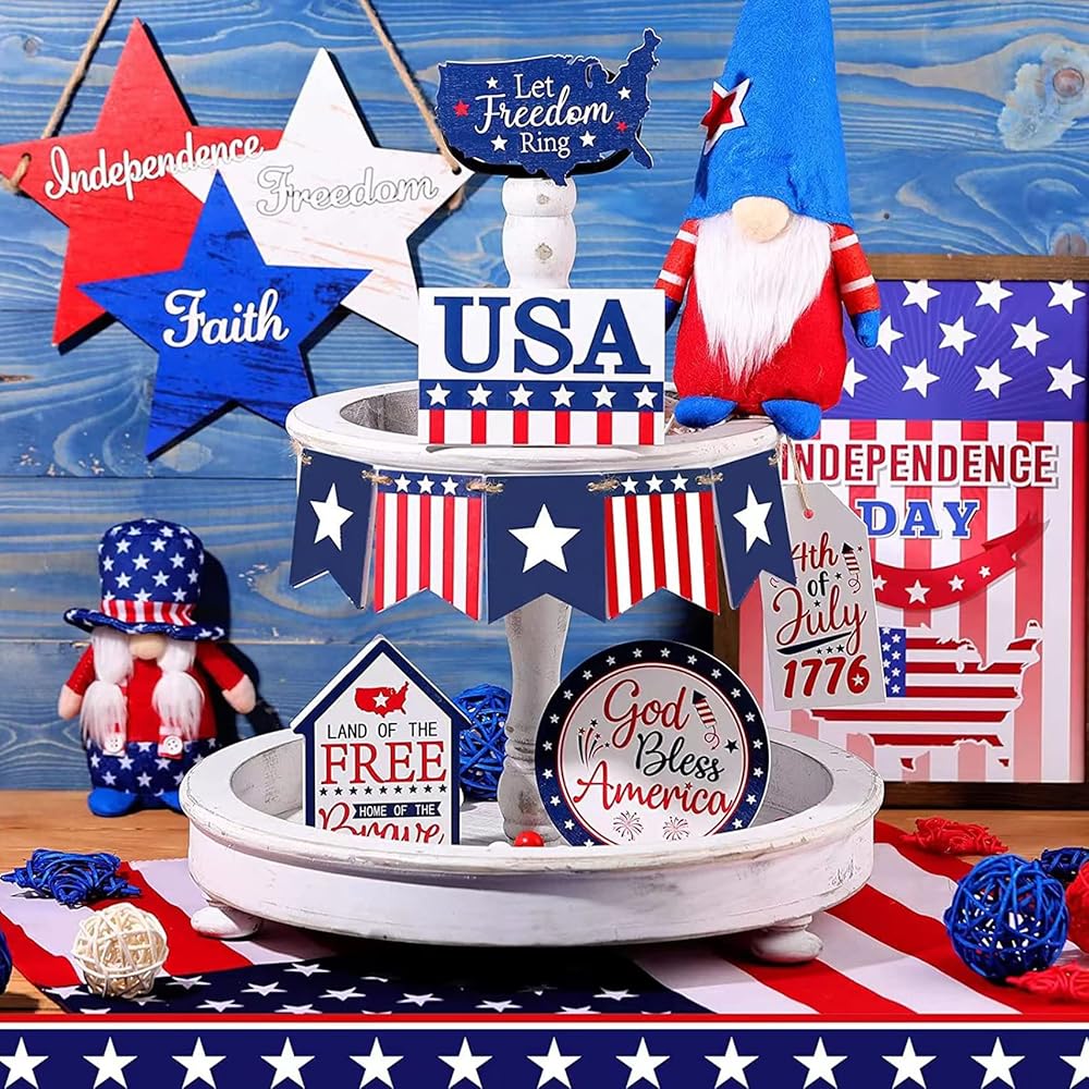 11 Pcs 4th of July Tiered Tray Decor, Patriotic Tiered Tray Decor Wood Signs Farmhouse Home Decorations for Memorial Day American Star Red White Blue Decoration Not Including Gnomes