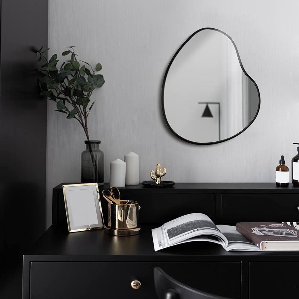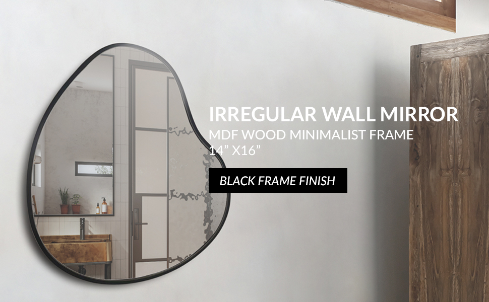 جودة فاخرة: المرآة المثبتة على الحائط ذات الشكل غير المنتظم مصنوعة من إطار خشبي MDF متين. هذه المرآة المجردة الفريدة آمنة وصديقة للبيئة. لوح خلفي من خشب MDF مقاس 12 ملم مع طلاء أسود.