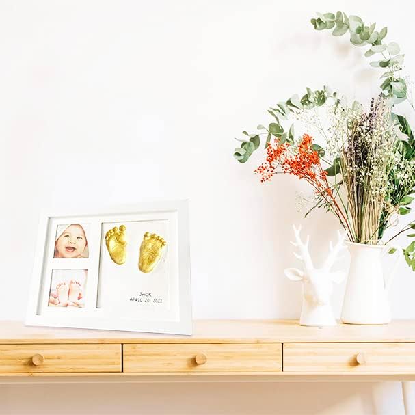 & مجموعة آثار أقدام الأطفال لدينا تأتي مع طلاء ذهبي وفرش، وإذا كنت تحب هذا اللون، يمكنك استخدامه لتلوين إطار الصورة، وعندما يجف، يمكنك استخدام أداة كتابة لتسجيل الرسائل النصية المهمة،