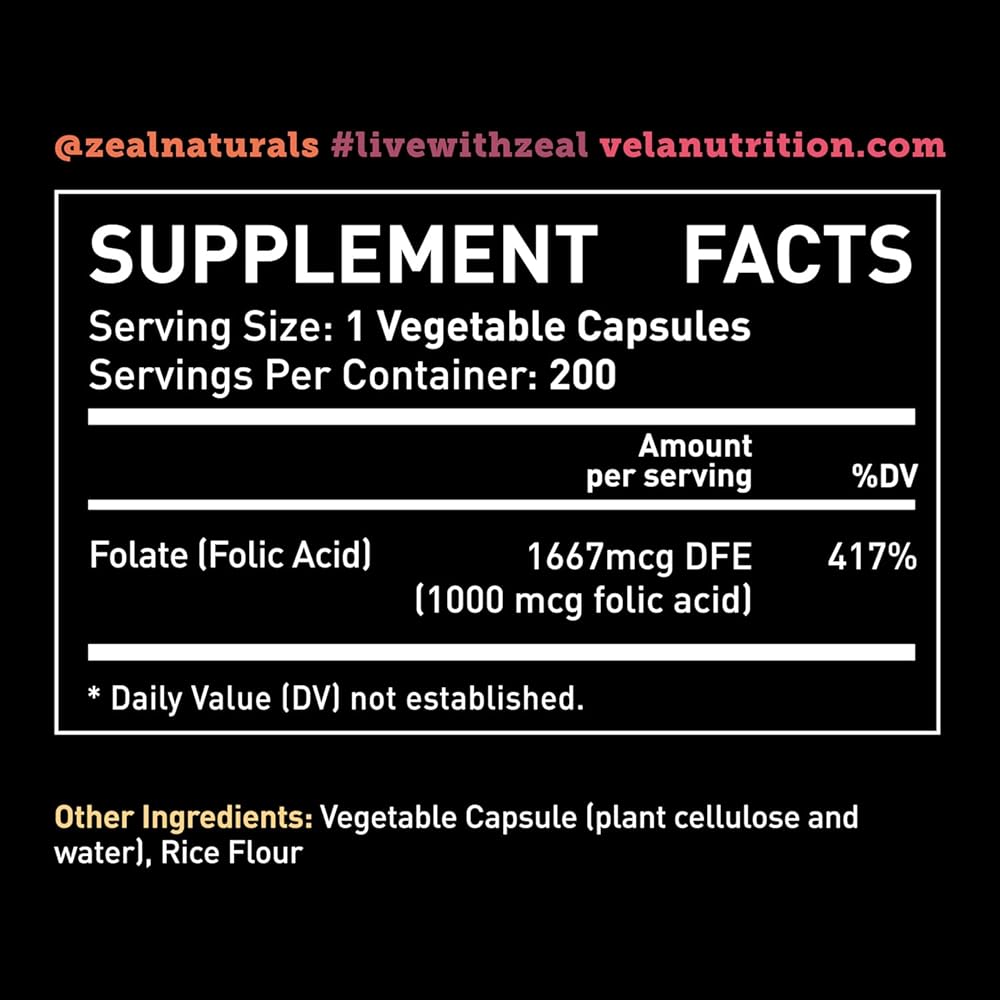 مكمل فيلا حمض الفوليك | 1000 ميكروجرام لكل جرعة، 200 كبسولة | دعم صحة القلب، ملحق دعم ما قبل الولادة | لا يحتوي على كائنات معدلة وراثيًا، وتم اختباره بواسطة طرف ثالث