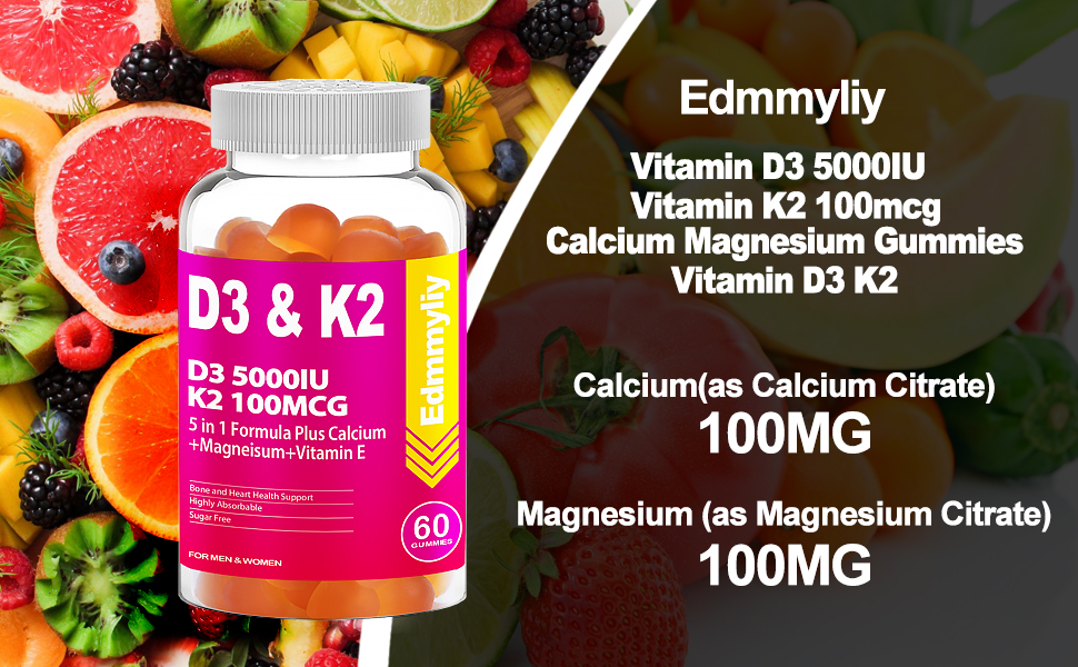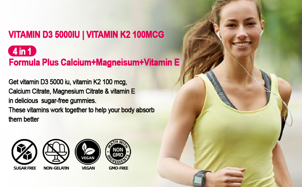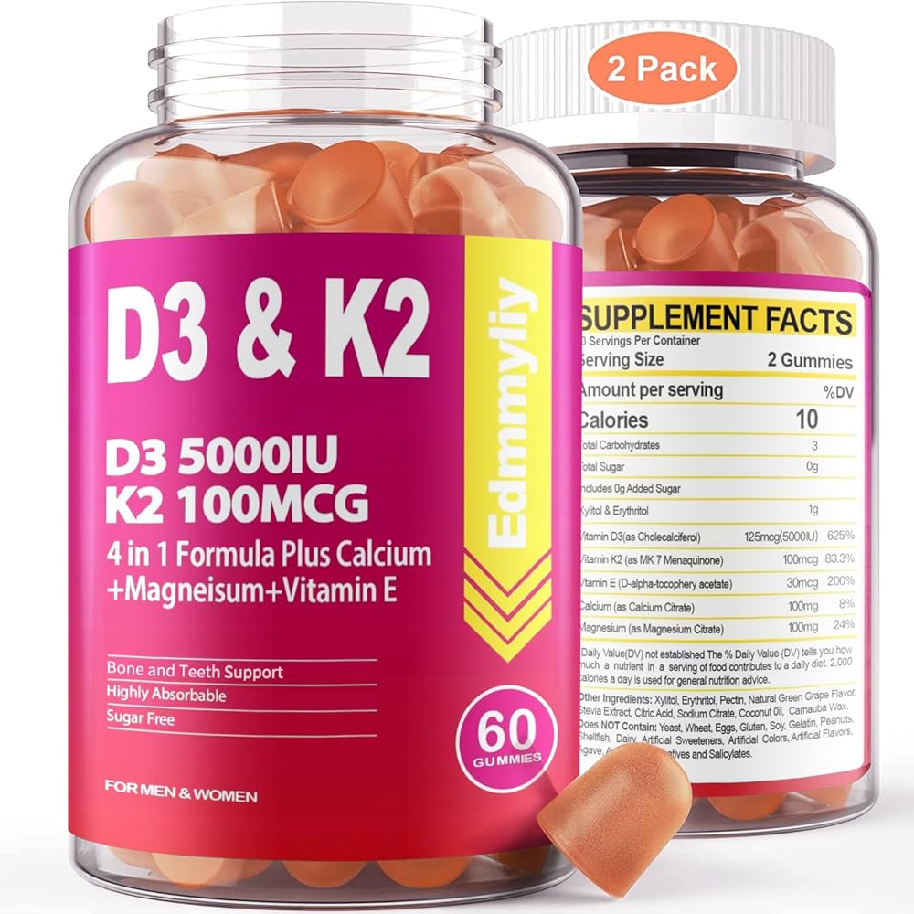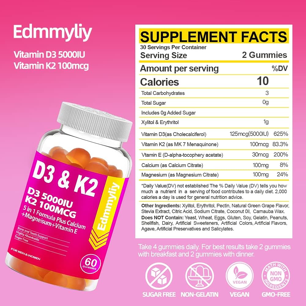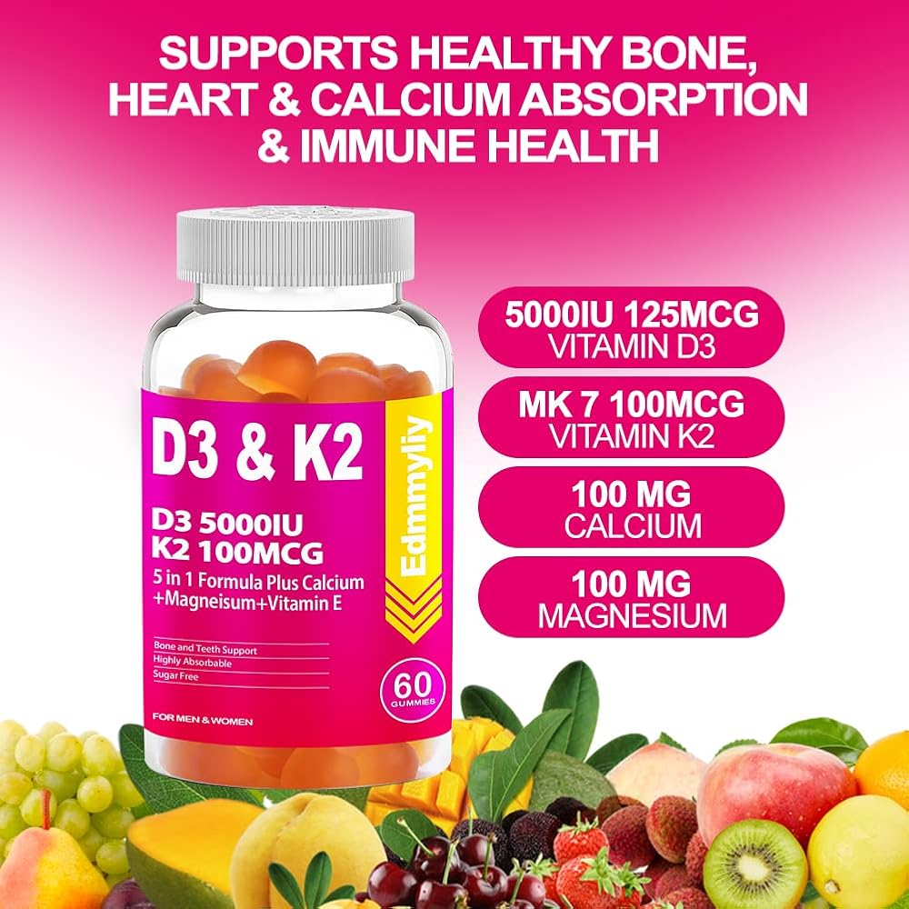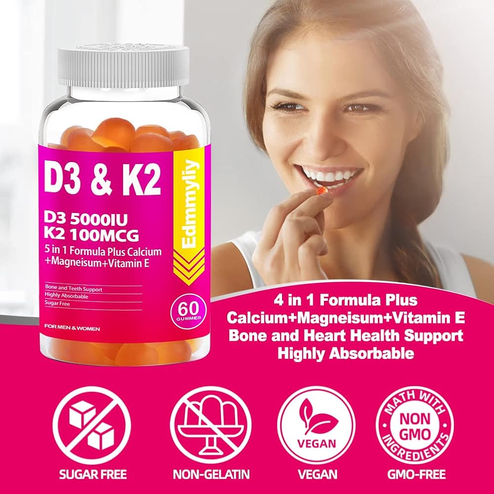 فيتامين د3 5000 وحدة دولية وفيتامين ك2 (Mk7): تحتوي كل جرعة على 5000 وحدة دولية و125 ميكروغرام من فيتامين د3 و100 ميكروغرام من مكملات فيتامين ك2 الصمغية توفر التركيبة المثالية للمساعدة في تقوية العظام والعضلات.