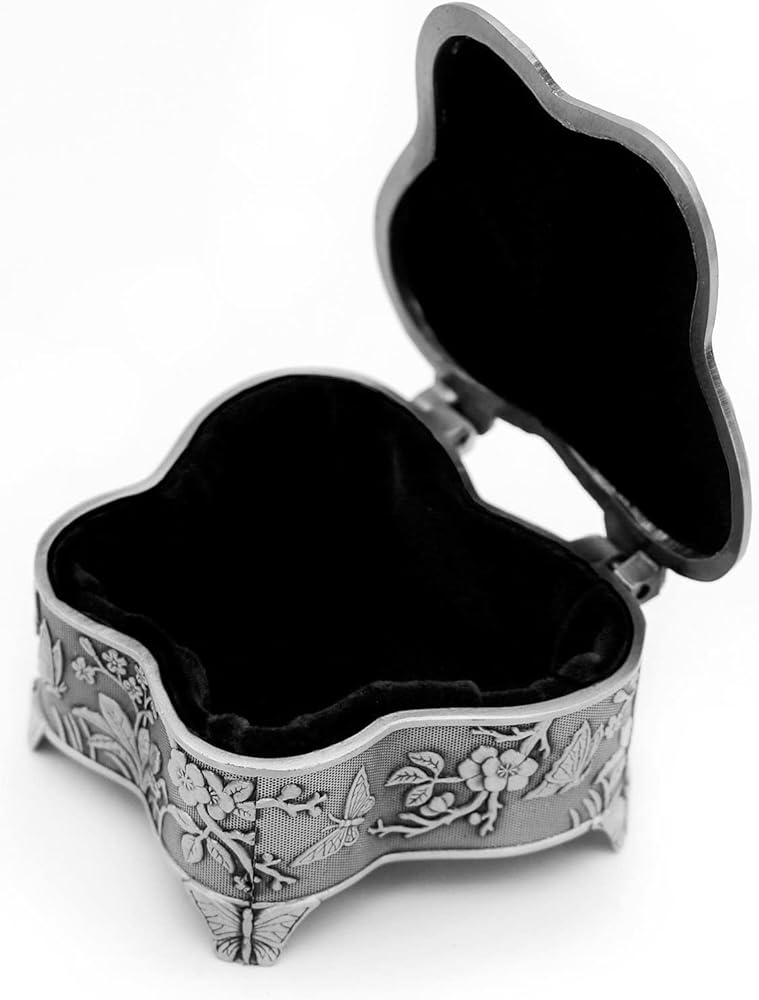 • صندوق حلي كلاسيكي - شكل فراشة أنيق، يتميز بنقوش كلاسيكية بنمط زهور عتيقة.