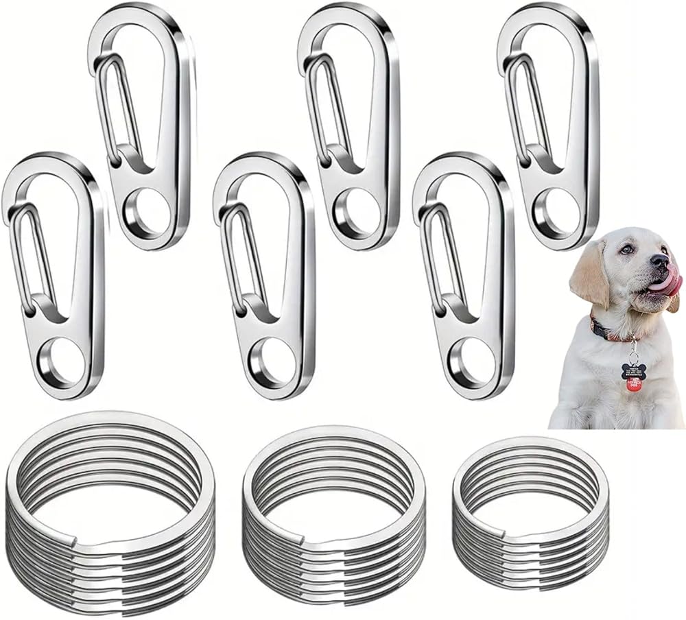 Product List:Dog Tag Clip 6pcs stainless steel pet ID tag holders + 18pcs stainless steel tag rings in 3 sizes.