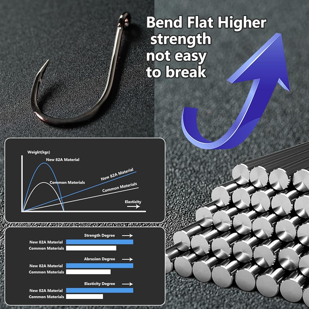 قوية ومتينة: خطافات الصيد مصنوعة من مادة فولاذية جديدة عالية الكربون 82A، يصعب ثني هذا الخطاف القوي. نظرًا لقوته الخاصة، وقوة الشد، والمرونة، والصلابة، ومقاومة التآكل والحياة، ويحسن معدل الصيد. مناسب للصيد في مجموعة متنوعة من بيئات المياه العذبة والمالحة.