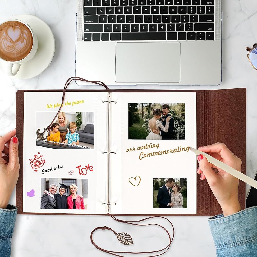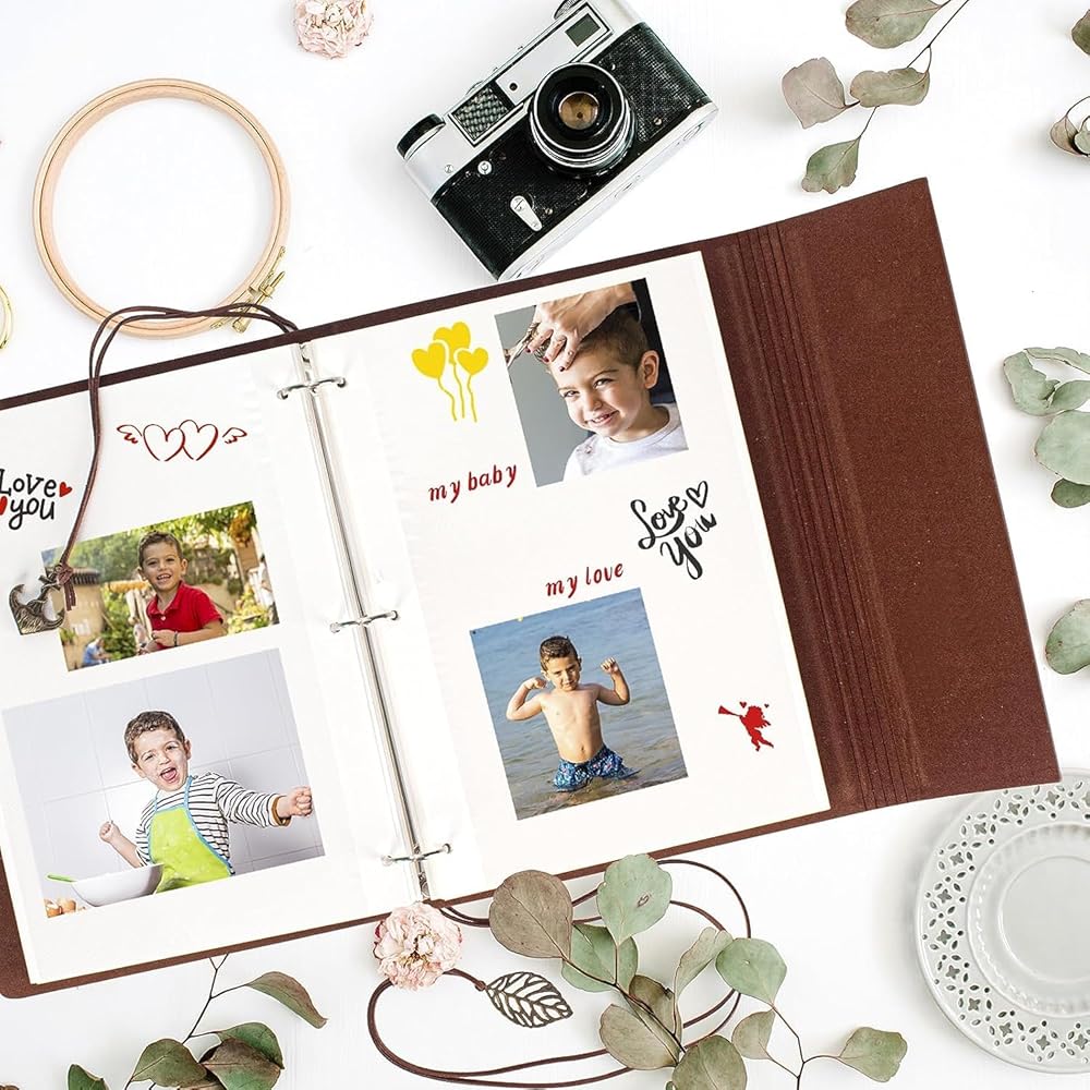 ✨【سجل قصاصات غطاء جلدي رائع】غطاء جلد صناعي ممتاز قوي ومتين، لا يبهت، وخالي من الأحماض. تضفي المعلقات المصنوعة من الحبال والمعدن البرونزي لمسة كلاسيكية على الألبوم. ألبوم الصور المكون من 3 حلقات من الفولاذ المقاوم للصدأ يسهل إضافة أو نقل الصفحات. أنيقة ومتينة، مثالية لتخزين ألبومات الصور.
