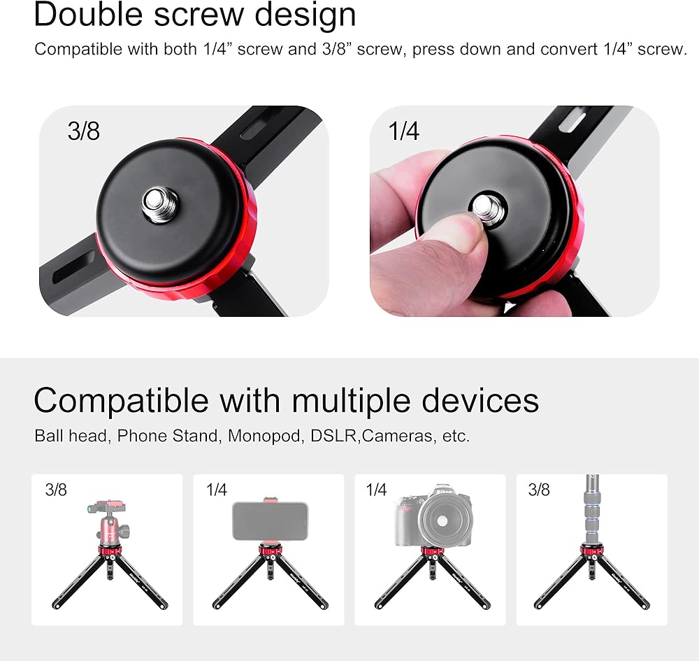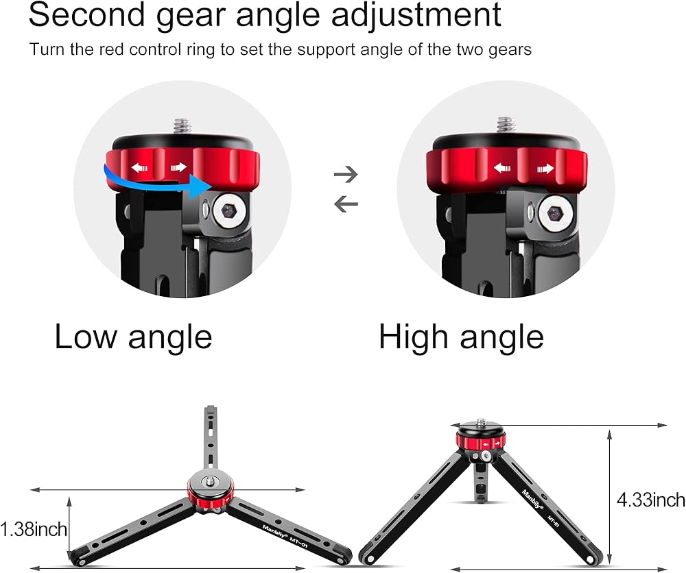 【ارتفاعان قابلين للتعديل】 يمكن تعديل أرجل الحامل ثلاثي القوائم بواسطة الحلقة الدوارة الحمراء، ويمكن أن توفر ارتفاعين مختلفين للتشغيل: أقصى ارتفاع للعمل هو 4.33 انش والحد الأدنى لارتفاع العمل هو 1.37 انش. جميع أقدام الكاميرا ثلاثية القوائم مصممة بمطاط مضاد للانزلاق لمنع الانزلاق والخدش.