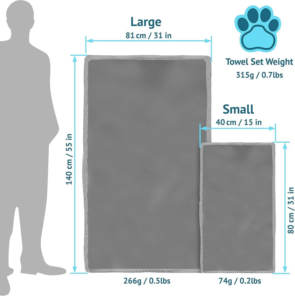 فائقة الامتصاص: المناشف الخاصة بنا، واحدة كبيرة وواحدة صغيرة، تمتص 5-7 مرات من الماء أكثر من المناشف الأخرى تاركة عظمة حيوانك الأليف الجميلة جافة. المقاسات التقريبية: 55 بوصة × 31 بوصة ، 31 بوصة × 16 بوصة.
