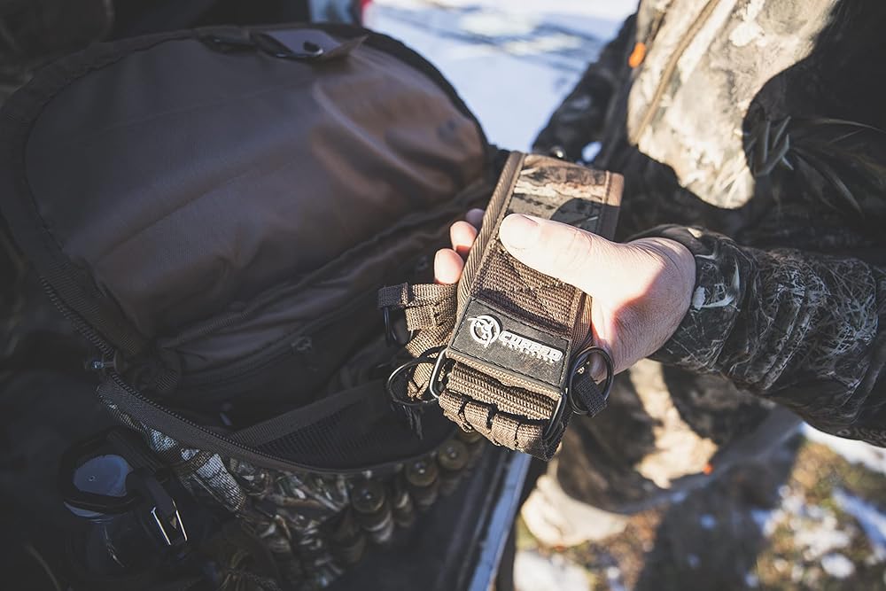 Cupped Waterfowl Duck Strap Metal Loops with nonslip backing, neoprene reinforced webbing and a heavy duty attachment clip. 8 powder coated steel loop connections for your limit and years of use Nonslip backing Neoprene with reinforced webbing for added strength Heavy duty attachment clip