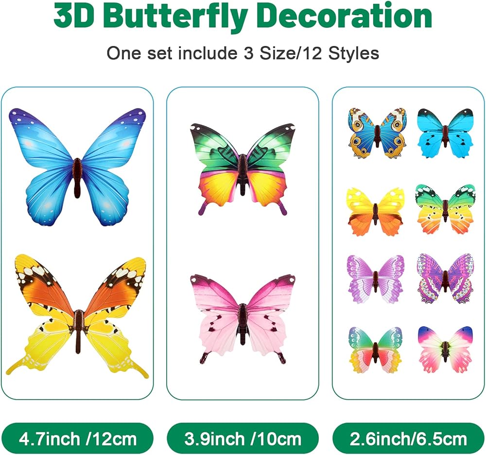 تتوفر مقاسات مختلفة: تأتي ديكورات الحائط ثلاثية الأبعاد على شكل فراشة في 3 مقاسات، بما في ذلك 2.6 انش/ 6.5 سم، 3.9 انش/ 10 سم و4.7 انش/ 12 سم، من السهل تلبية احتياجات الديكور المختلفة الخاصة بك