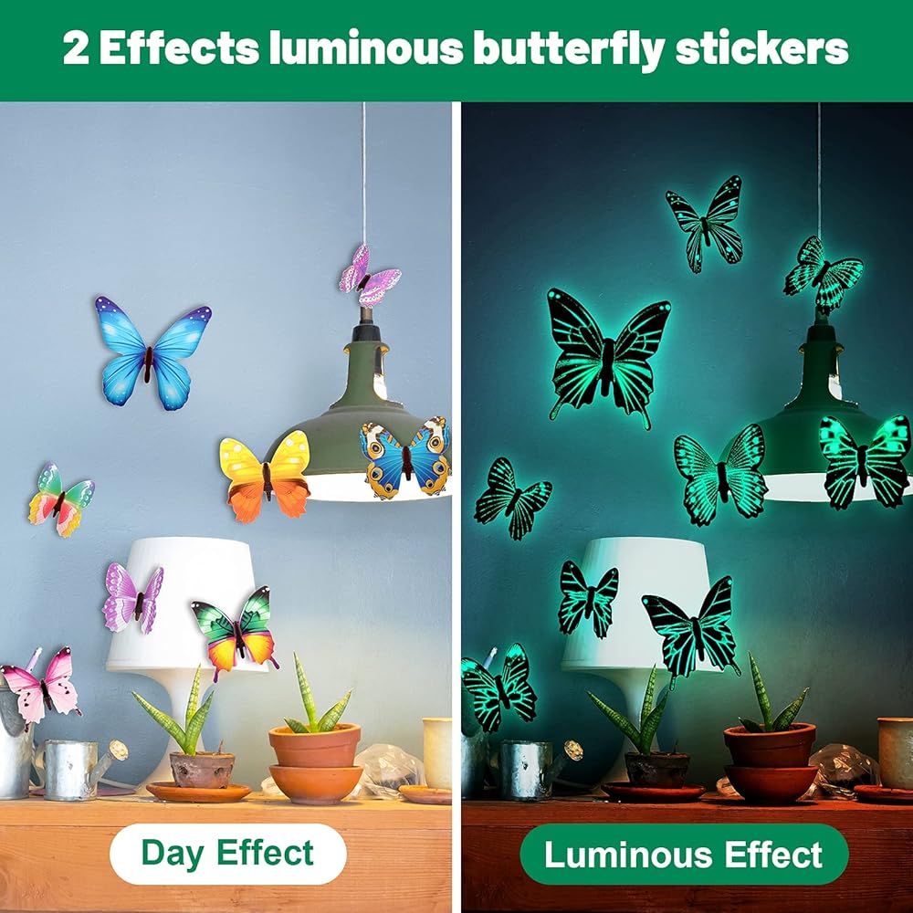 2 ملصقات فراشة متوهجة مؤثرة: عندما يكون النهار، ملصقات الفراشة ثلاثية الأبعاد الملونة مثل الفراشة الواقعية التي تطير على الحائط، مع حلول الليل، يمكن أن تتوهج ملصقات الحائط على شكل فراشة في الظلام وتظهر تأثيرات مختلفة ليلاً ونهارًا