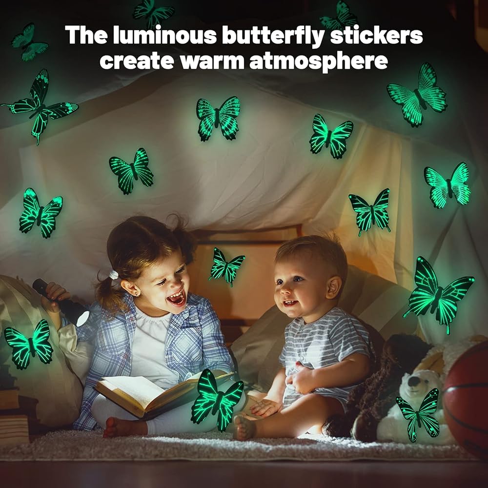 ملصقات تزيين متعددة الوظائف: يمكن استخدام ملصقات الفراشة المتوهجة في الظلام كديكور للجدران، وديكور جميل لغرفة الأطفال، وديكور السقف، وهدية لطيفة لحفلتك لحفلات الزفاف والذكرى السنوية وأعياد الميلاد وما إلى ذلك