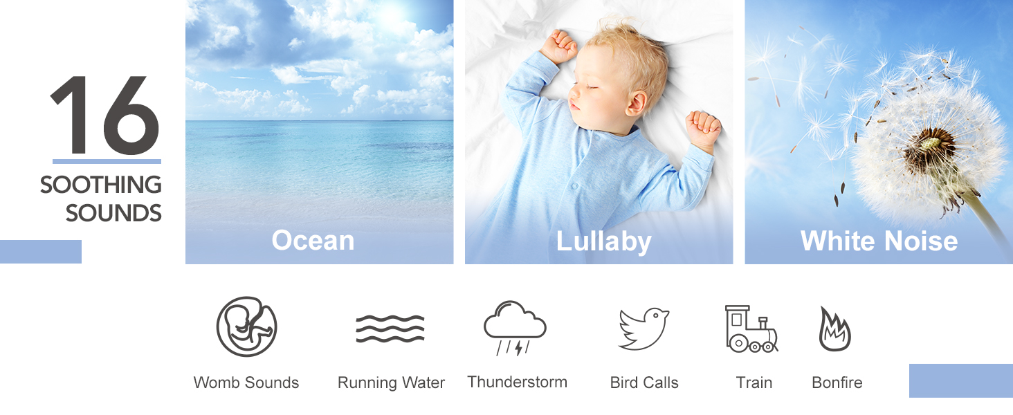 • ثلاثة خيارات توقيت وخاصية الذاكرة القوية: إيقاف تلقائي مع خيارات فاصل زمني 30 و60 و90 دقيقة لتوفير الطاقة. ستتذكر وظيفة الذاكرة الإعدادات السابقة تلقائيًا، وسيتم تذكر آخر صوت ومستوى الصوت المستعمل عند إعادة التشغيل بحيث لا يحتاج صوت طفلك المفضل أو طفلك إلى إعادة ضبطه