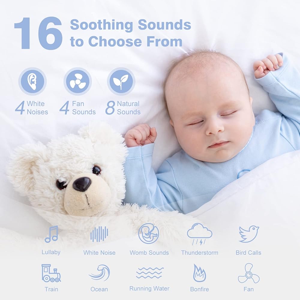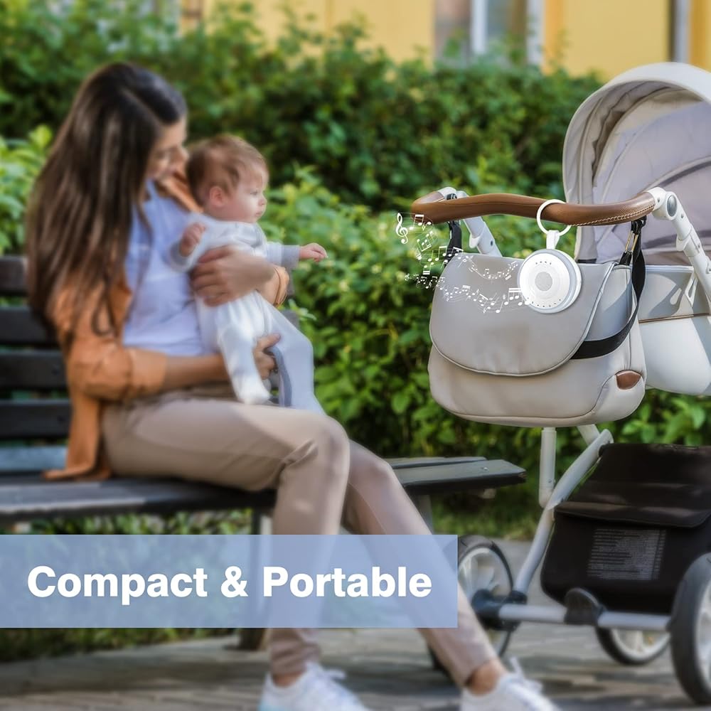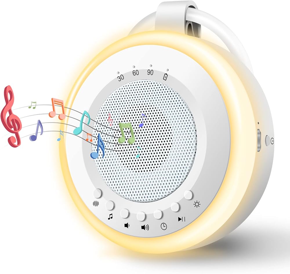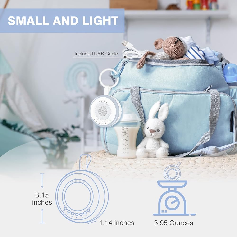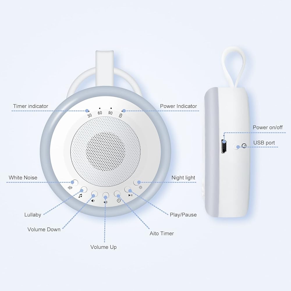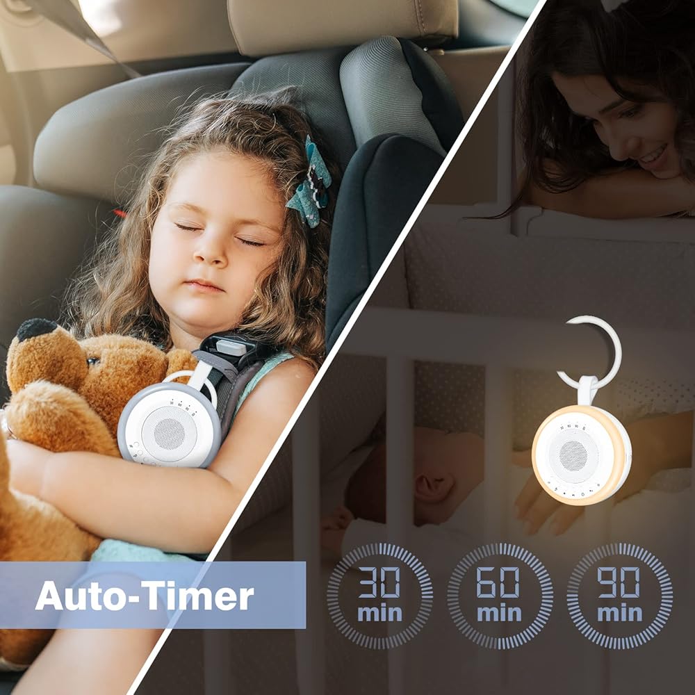 آلة صوت بيضاء محمولة للرضع: سهلة الارتداء في المنزل 2 في 1 ضوء ليلي | 16 صوت تهويدات مهدئة، وأصوات طبيعية و3 إعدادات مؤقت للسفر | قابلة للشحن عبر USB | سهلة التعليق | GM-02