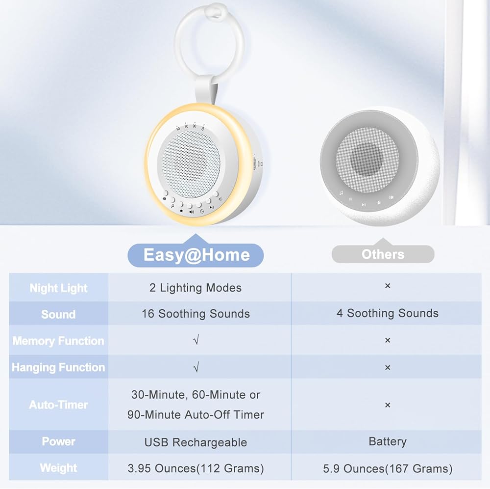 • صغير وقوي: تجمع هذه الآلة من إيزي آت هوم بين ضوضاء الاسترخاء والضوء الليلي وتساعد على النوم والهدوء في جهاز واحد سهل الاستخدام. يبلغ قطرها 8 سم ووزن 0.11 كجم، يمكن وضع آلة الصوت الصغيرة بسهولة في حقائب الحفاضات وعلى الأطفال وفي حقائب الظهر والعديد من المحافظ وأكثر من ذلك، ويمكن تثبيتها بأي شيء بكل سهولة. إنها ليست فقط آلة صوت النوم للأطفال الرضع، ولكنها أيضاً آلة ضوضاء بيضاء فعالة للبالغين من أجل النوم والاسترخاء أيضًا.