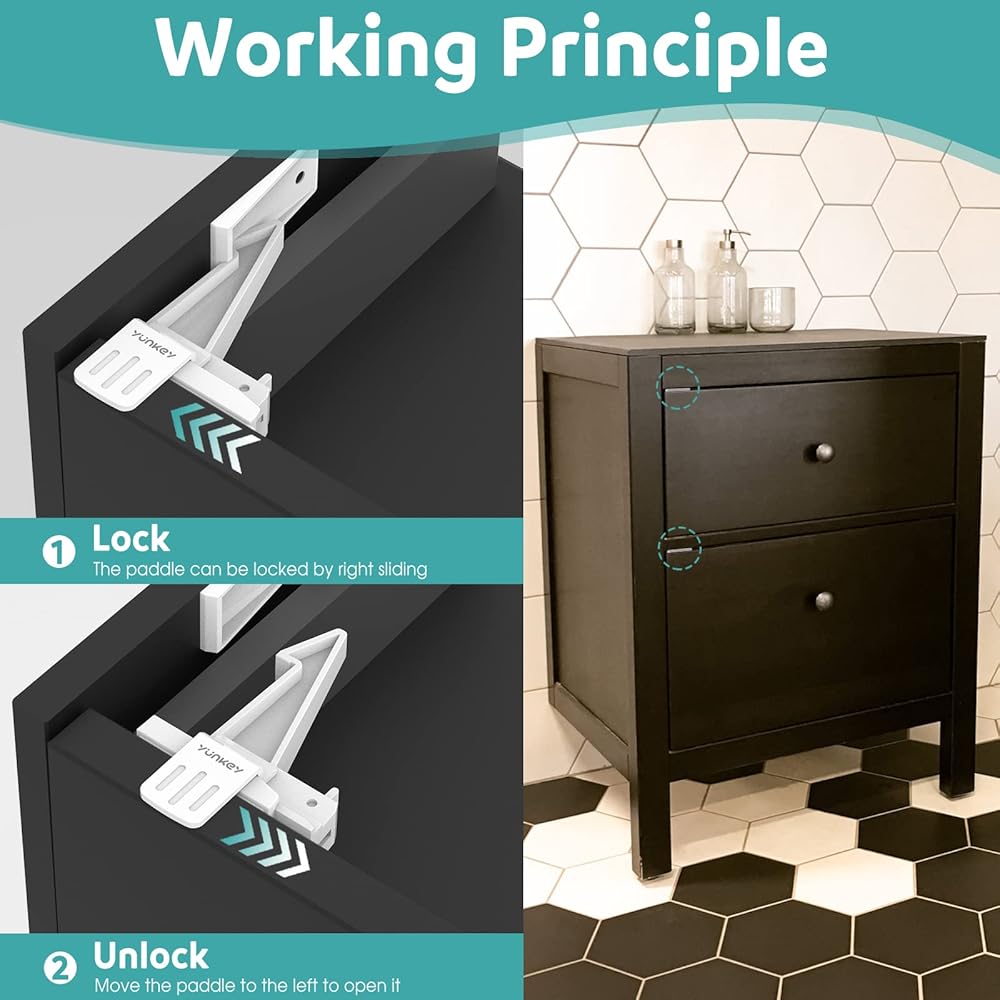 👶🏻TWO TYPES OF UNLOCKING FOR EASY USE: The slide on the lock is free to assemble, one-piece slide design is more concise and convenient than the key unlocking method, if you want the lock more invisible you can choose not to use the slide, unlock the drawer from the side of a click to open the lock.